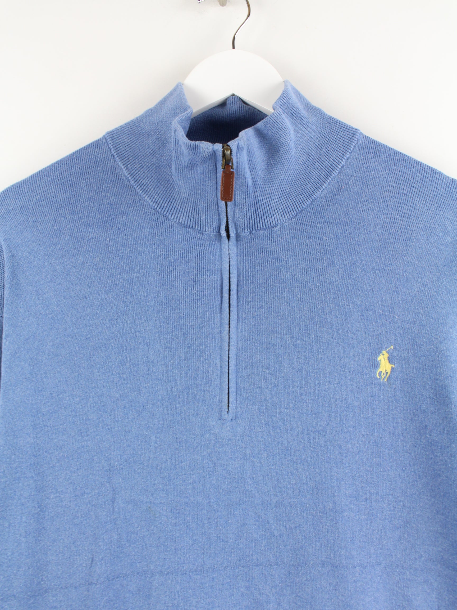 Blauer Pullover mit half Zip von Ralph Lauren in Größe XL. Er ist aus Baumwolle gemacht und in gutem Zustand bei uns zu bekommen.