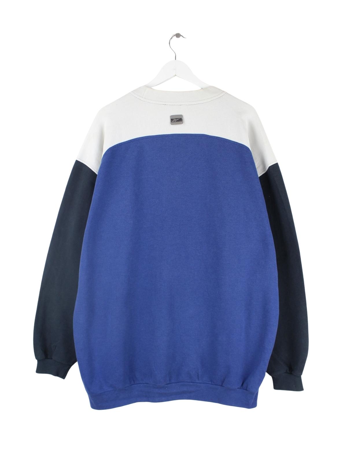 Sweater aus dem Hause Reebok in Größe XXL aus den 90'ern. Er ist aus einer Baumwollmischung produziert und in Blau in Stock.
