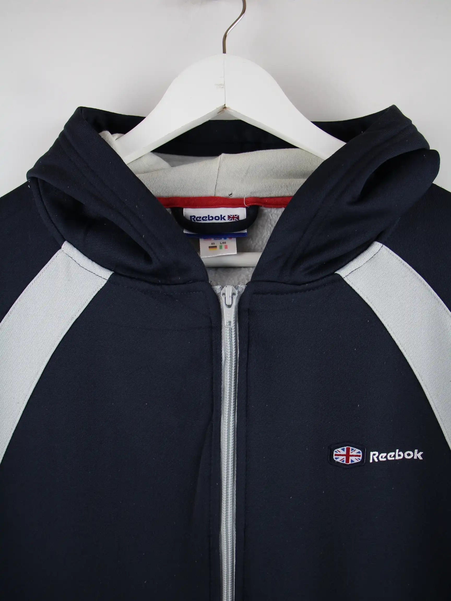 Blaue Trainingsjacke aus dem Hause Reebok in Größe M. Sie ist aus Synthetik angefertigt und in gutem Zustand bei uns zu bekommen.