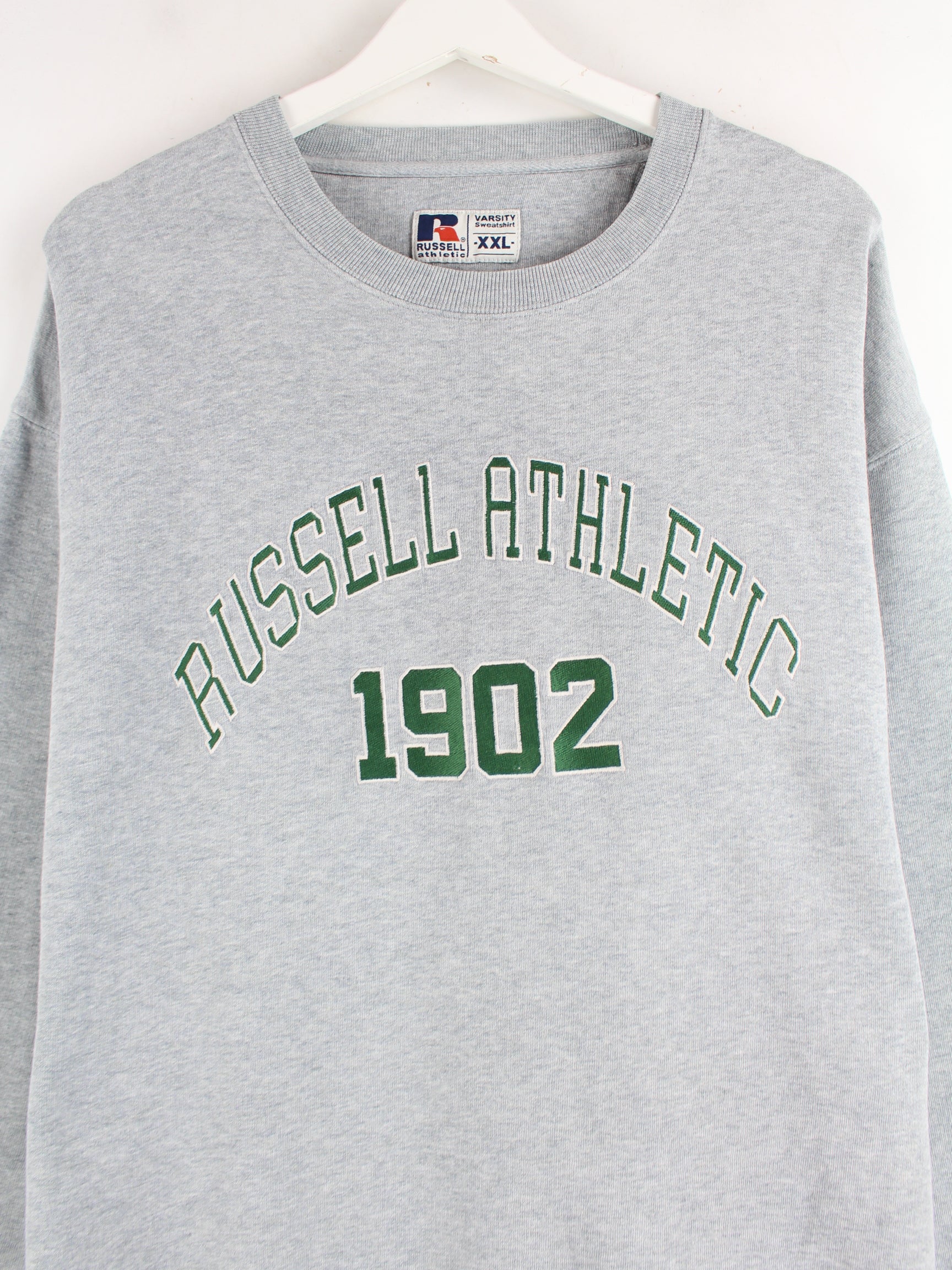 Grauer Sweater mit Stickereien der Brand Russell Athletic in Größe XXL. Er ist aus einer Baumwollmischung produziert und in sehr gutem Zustand zu haben.