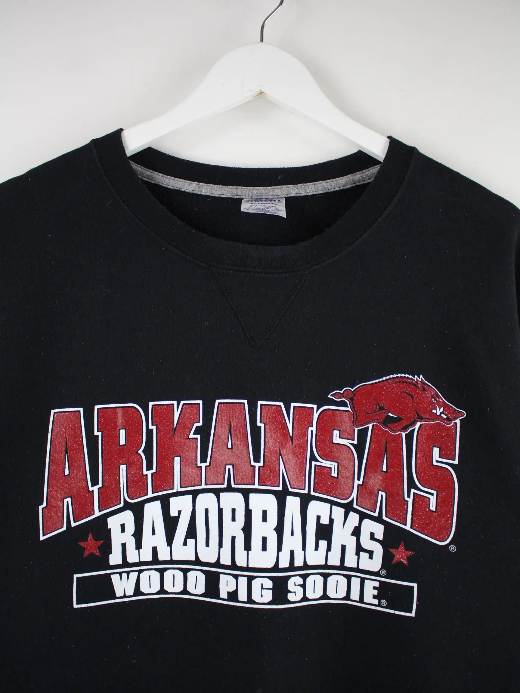 Sweater aus dem Hause Russell Athletic in Größe XL. Er ist aus einer Baumwollmischung produziert und in Schwarz vorrätig. Mit seltenem Razorbacks Print.
