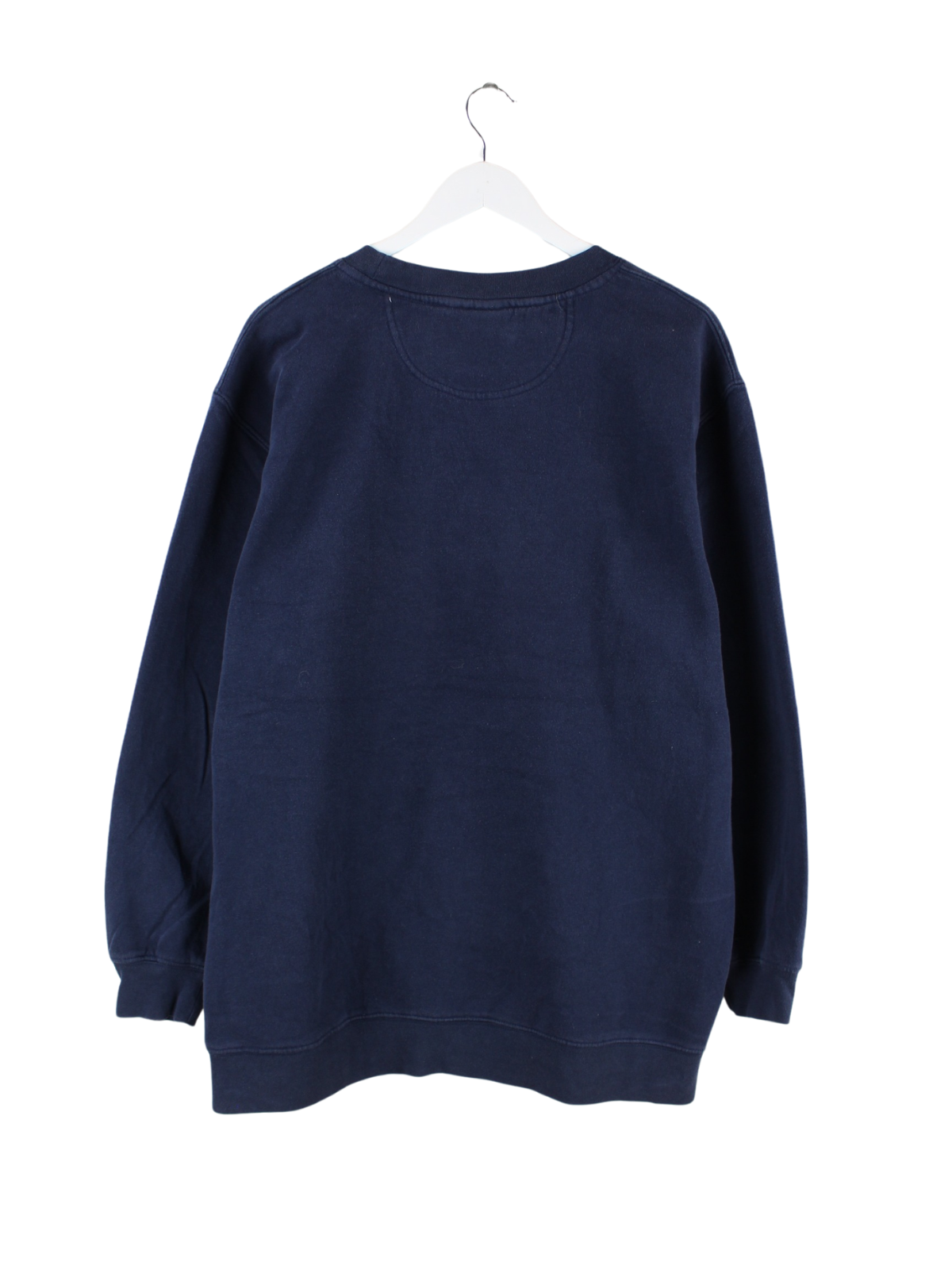 Vintage Sweater mit gesticktem Logo in Größe L. Er ist aus einer Baumwollmischung gefertigt und in Blau vorrätig.