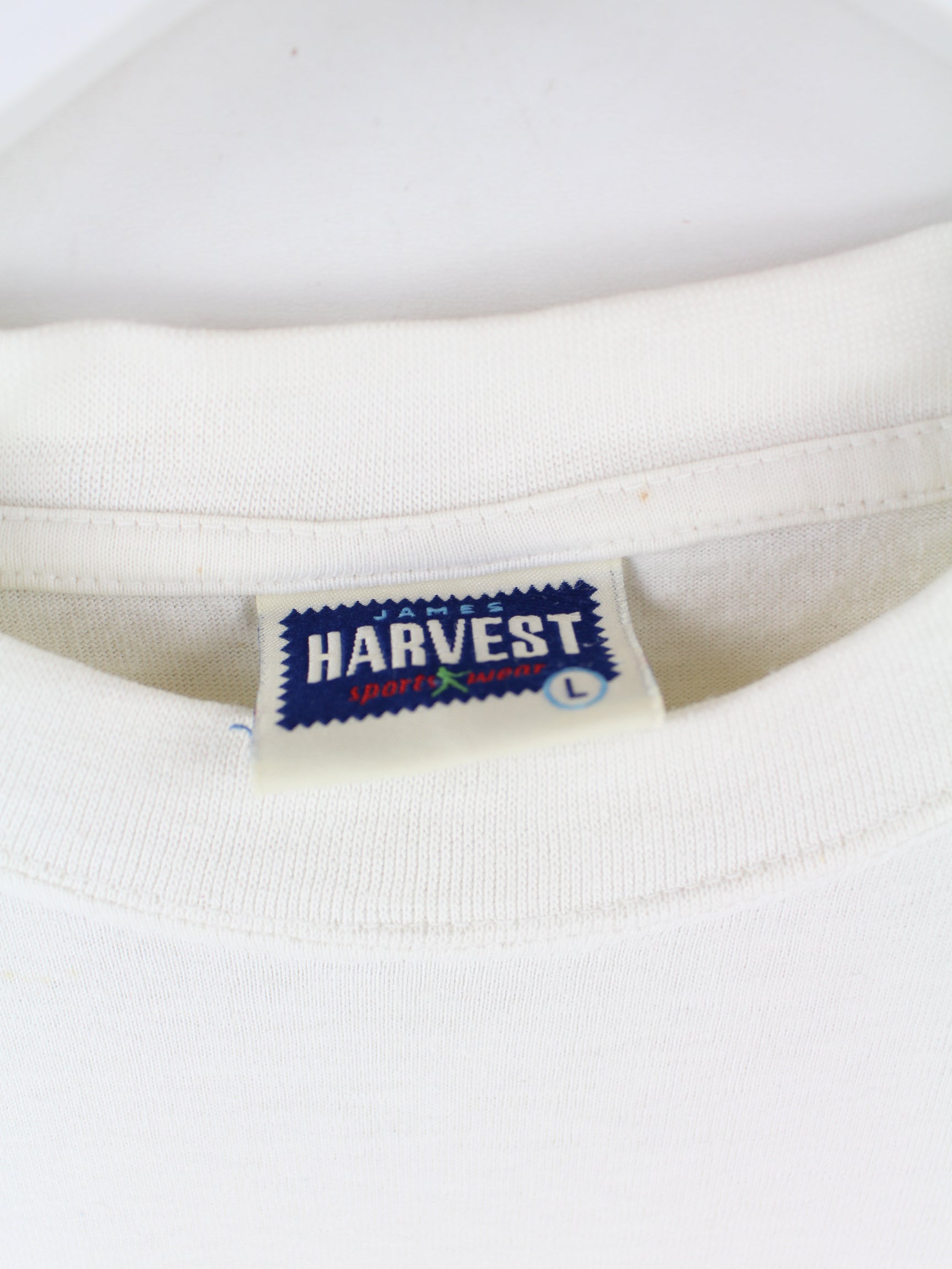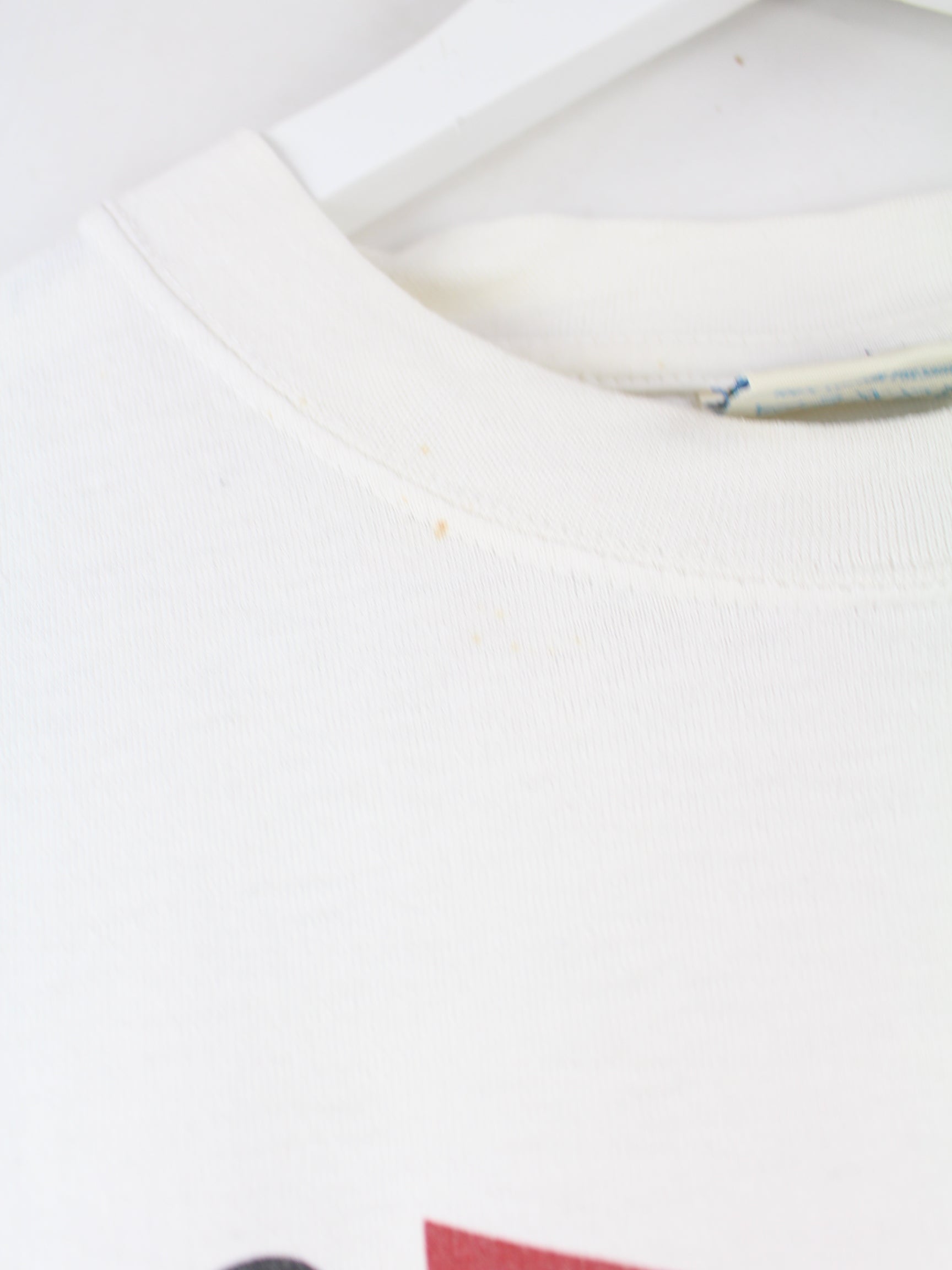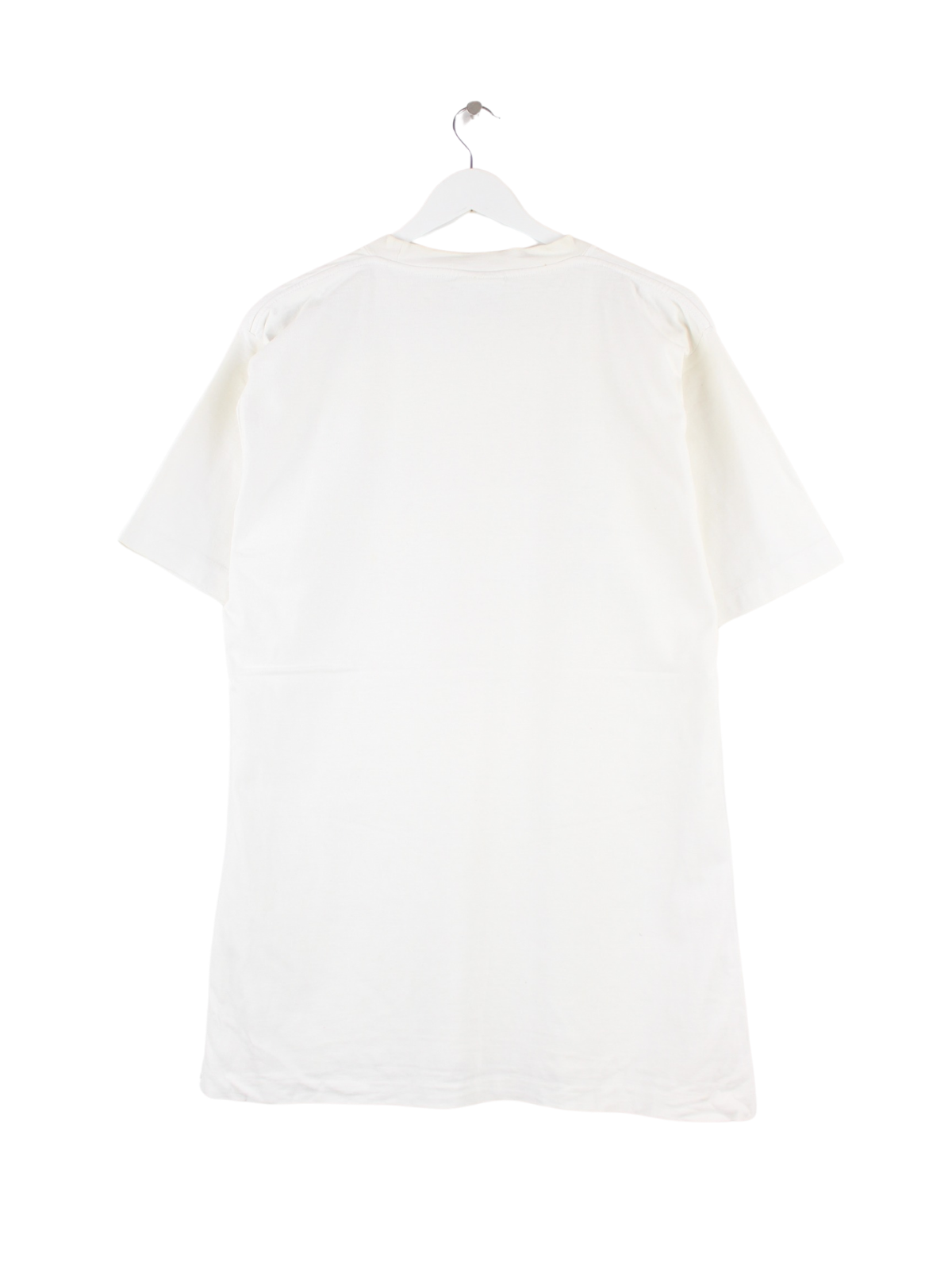 Weißes Vintage T-Shirt aus den 90'ern in Größe L. Es ist aus einer Baumwollmischung angefertigt und in gutem Zustand bei uns zu bekommen. Mit chiquem Radio Print.