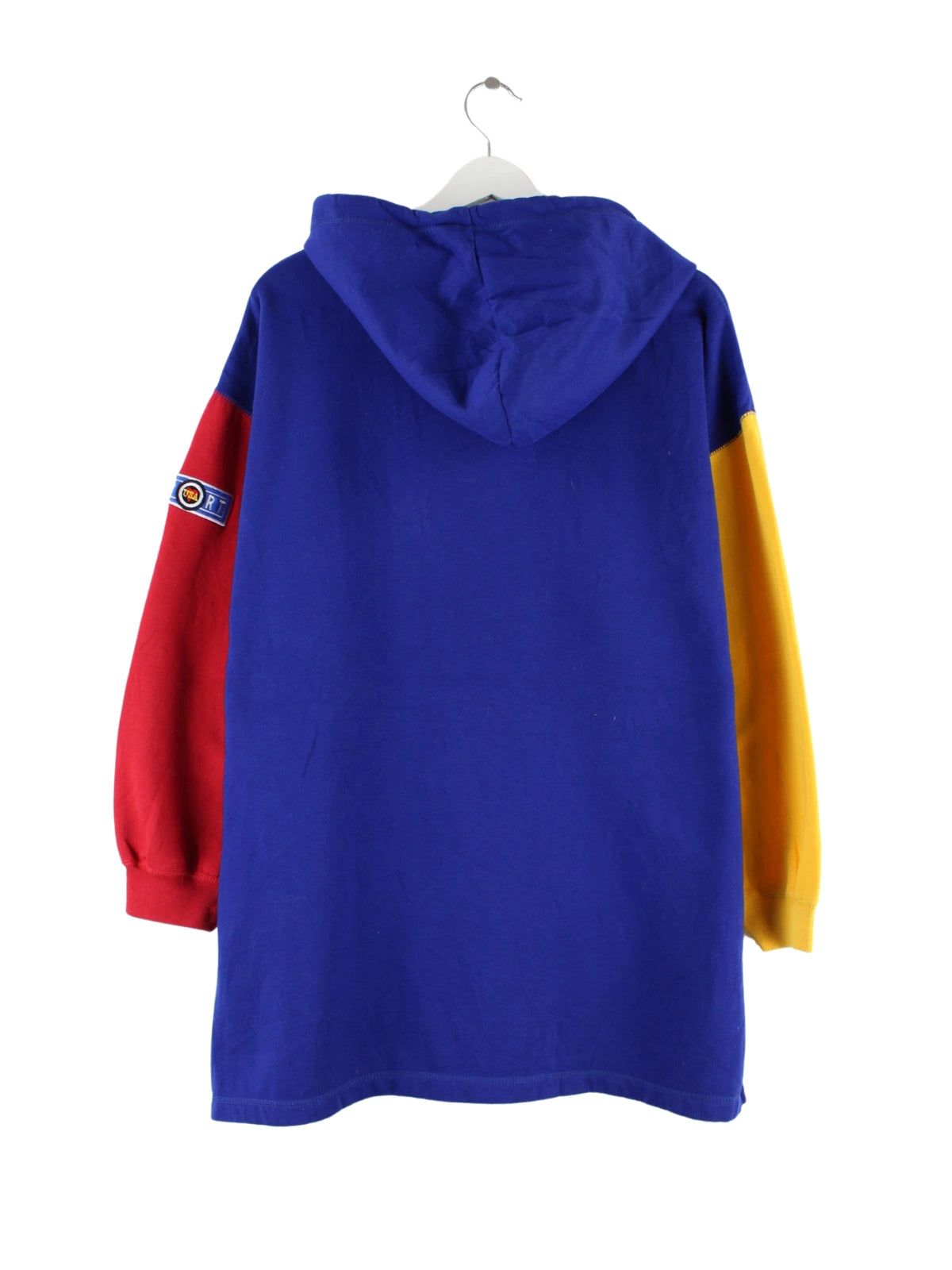 Vintage Hoodie mit gestickten Motiven in Größe M. Er ist aus einer Baumwollmischung gefertigt und in Blau vorrätig.