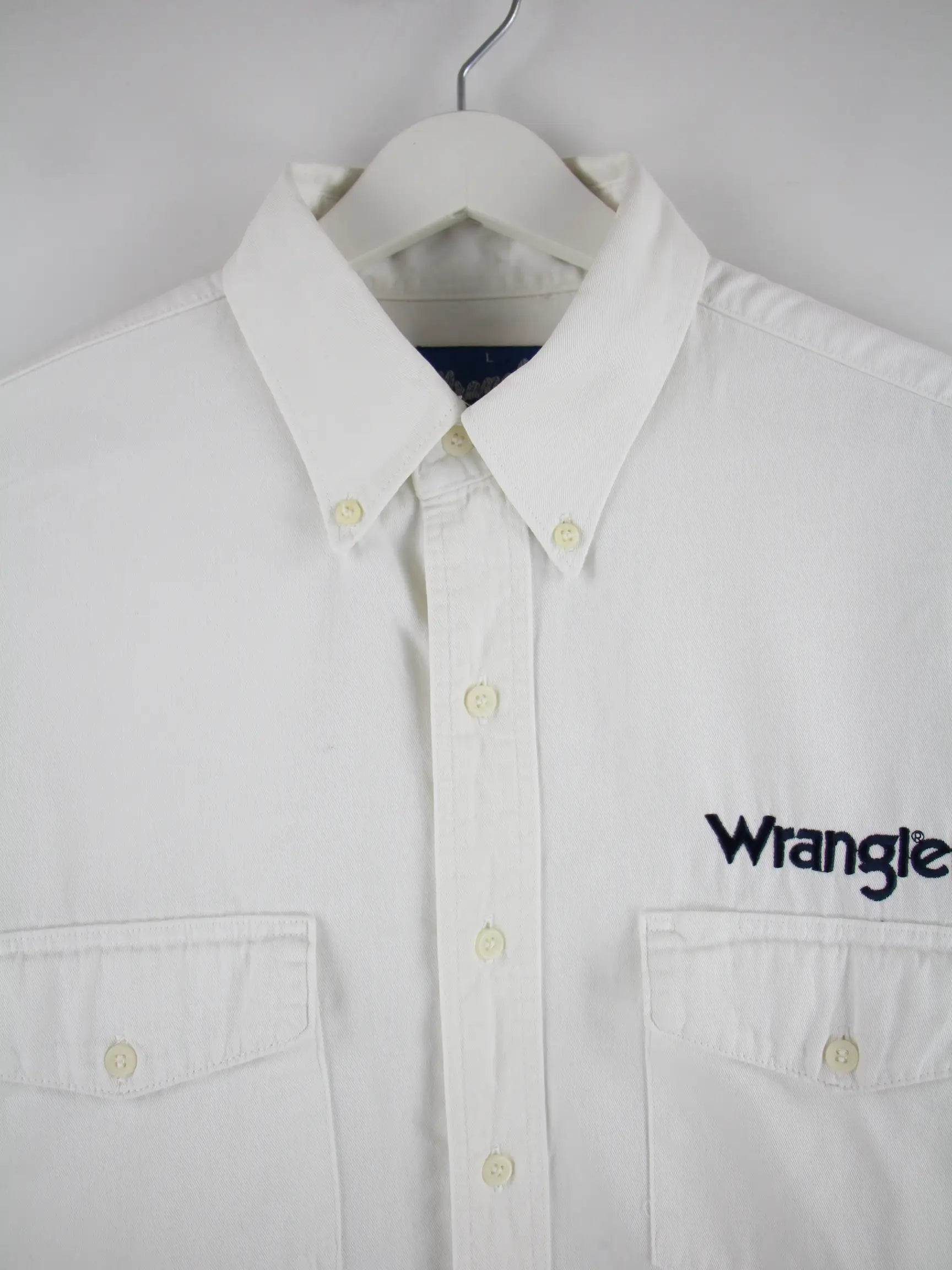 Freizeit Hemd des Labels Wrangler in Größe L aus den 90'ern. Es ist aus Baumwolle produziert und in Weiß auf Lager.