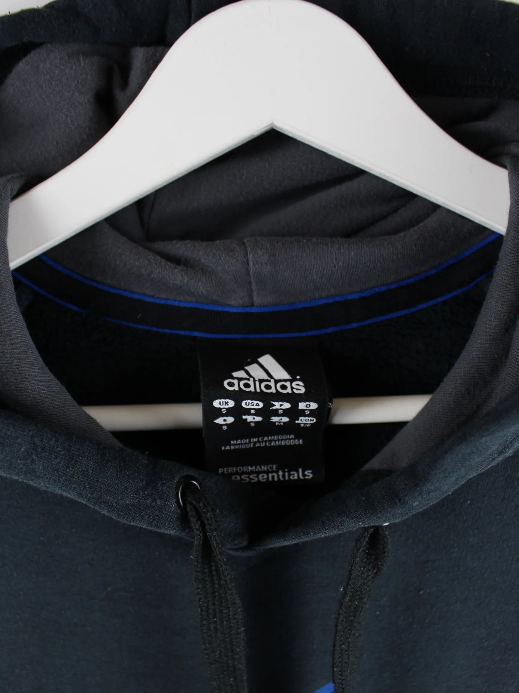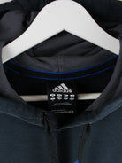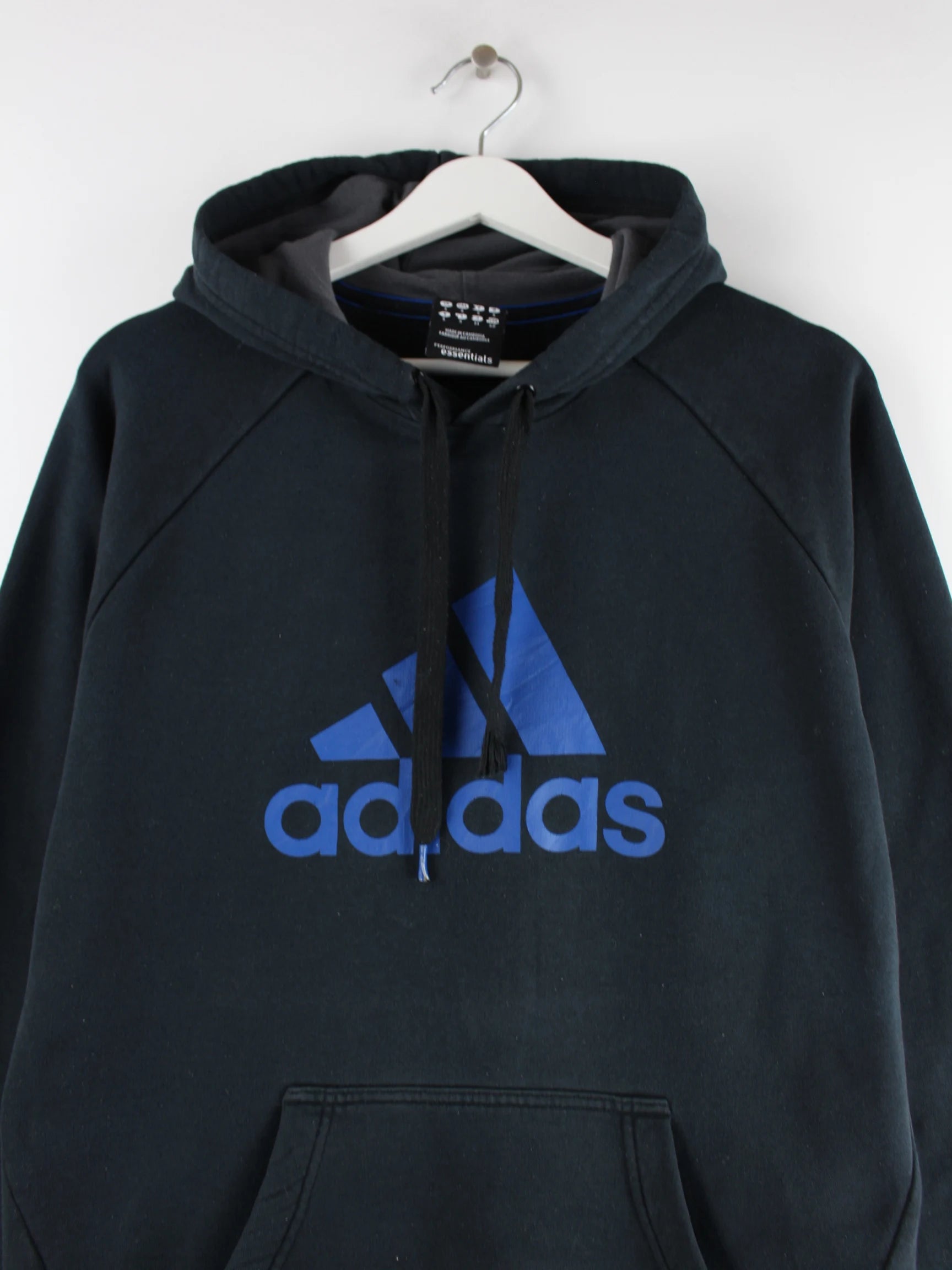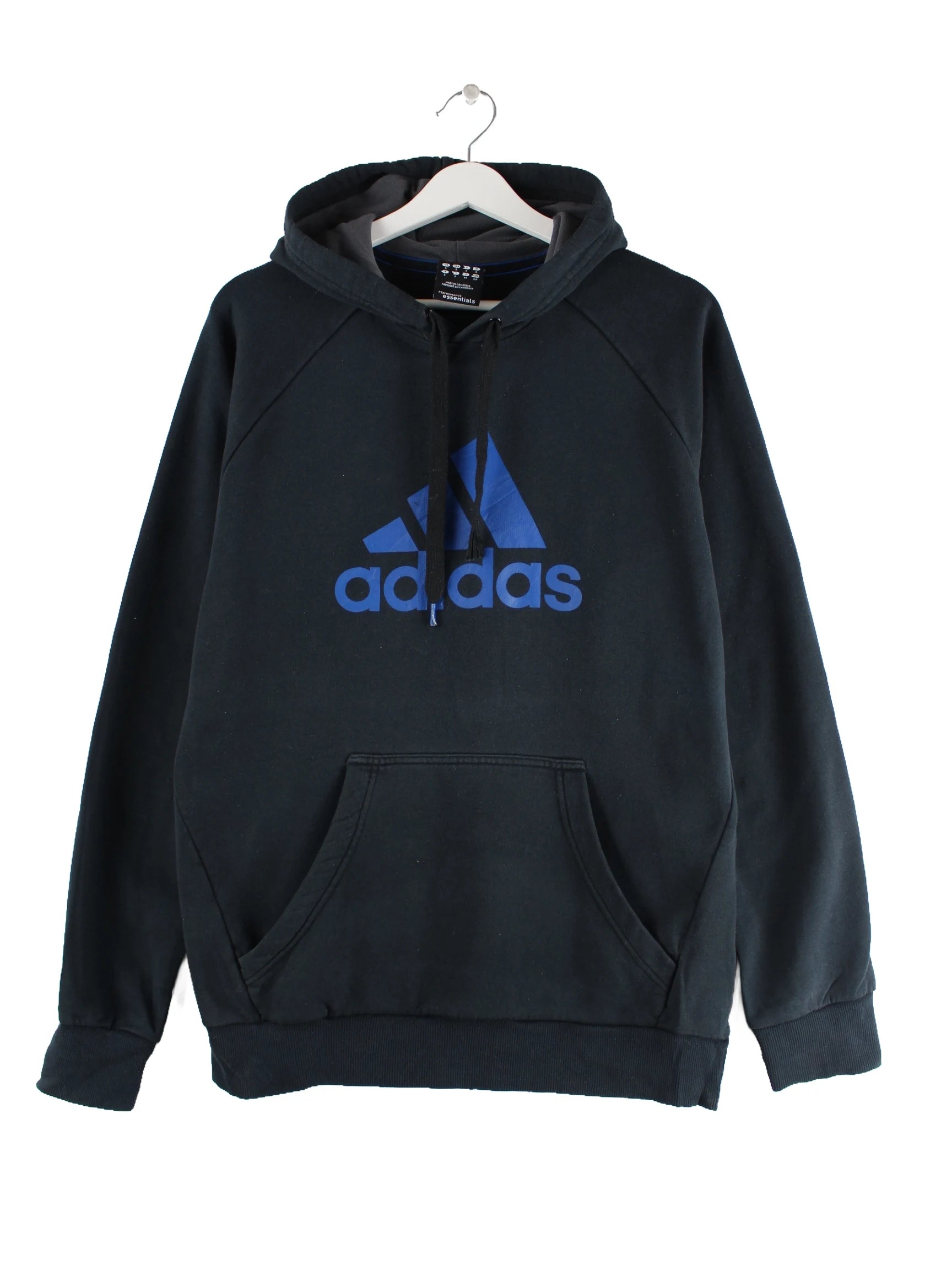 Schwarzer Hoodie aus dem Hause Adidas in Größe S. Er ist aus einer Baumwollmischung angefertigt und in gutem Zustand bei uns vorrätig. Mit schönem Logo Print.
