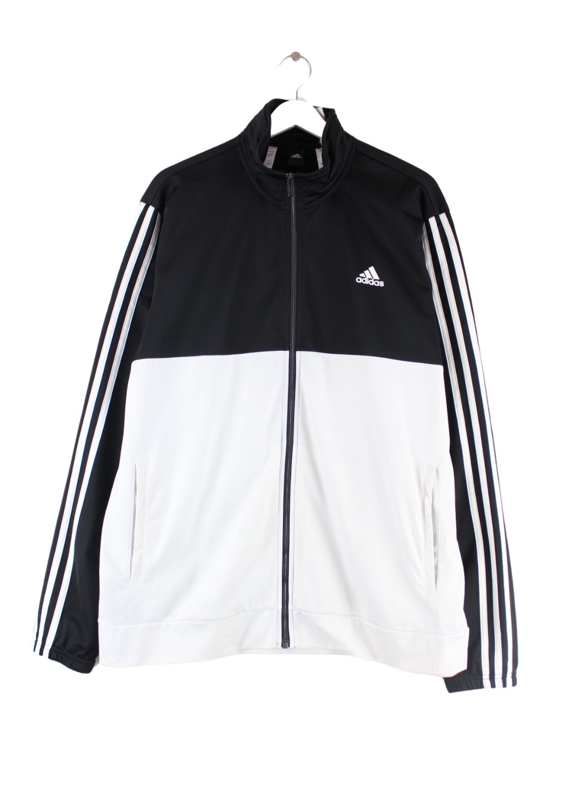 Schwarze Trainingsjacke vom Label Adidas in Größe XL. Sie ist aus Synthetik hergestellt und in gutem Zustand in Stock.