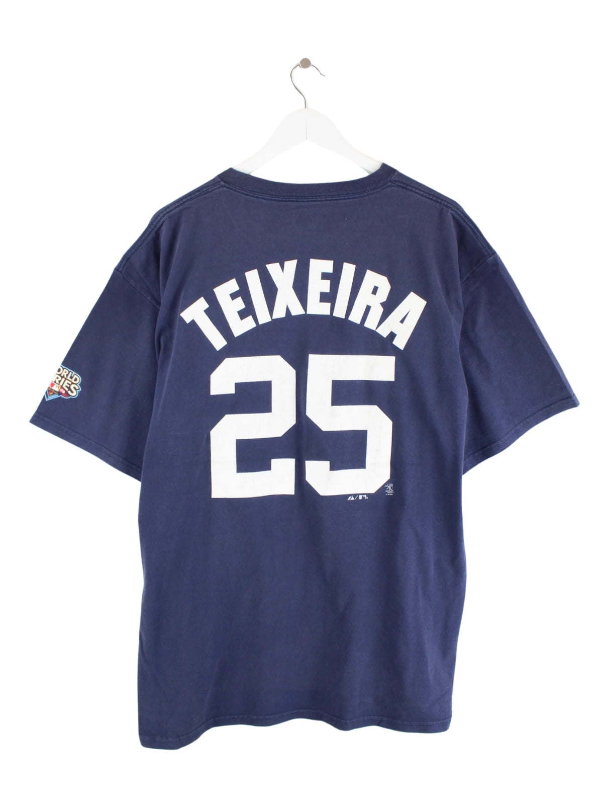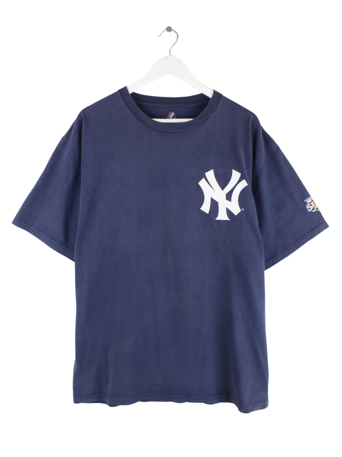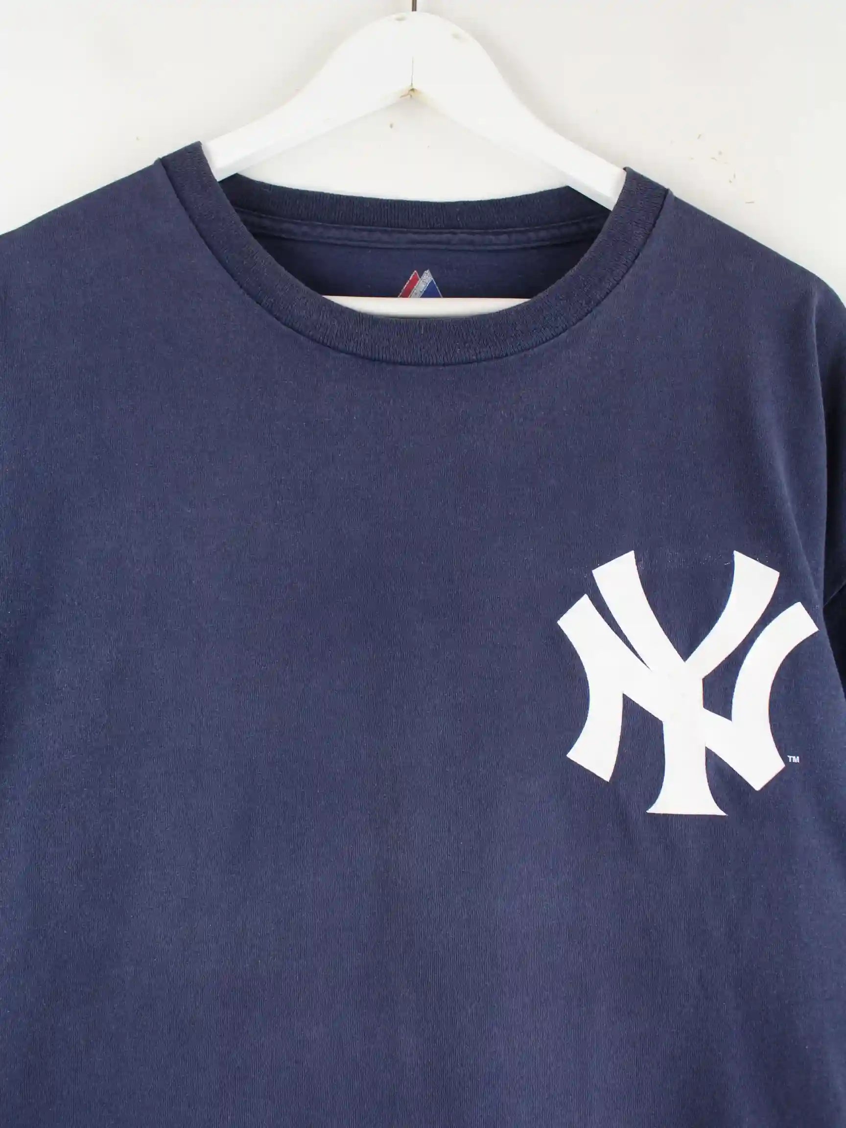 T-Shirt der Brand Majestic in Größe XL. Es ist aus Baumwolle gefertigt und in Blau bei uns vorrätig. Mit schickem Yankees Print.