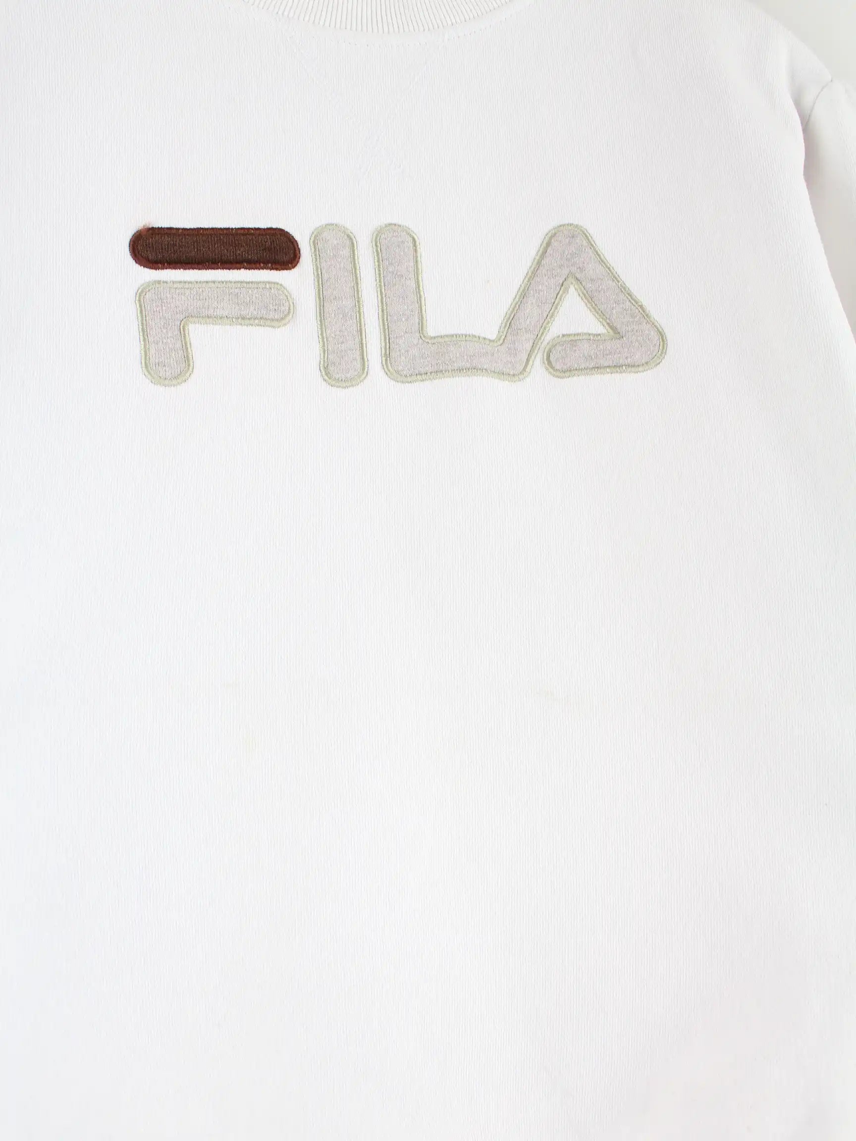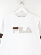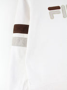 Sweater aus dem Hause Fila mit gestickten Motiven in Größe L. Er ist aus einer Baumwollmischung gefertigt und in Weiß auf Lager.