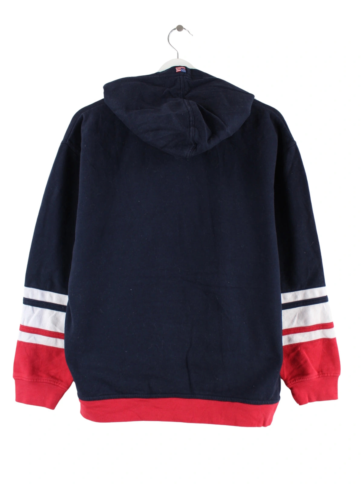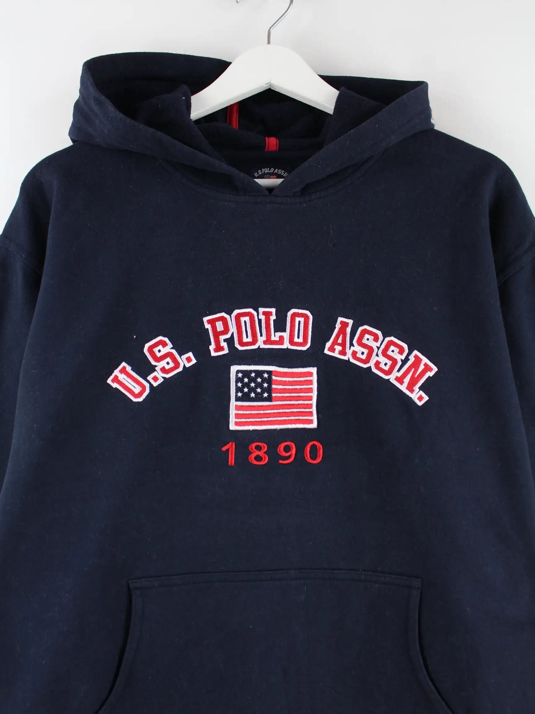Blauer Hoodie mit gestickten Motiven von U.S. Polo ASSN. in Größe S. Er ist aus einer Baumwollmischung gefertigt und in gutem Zustand im Angebot.