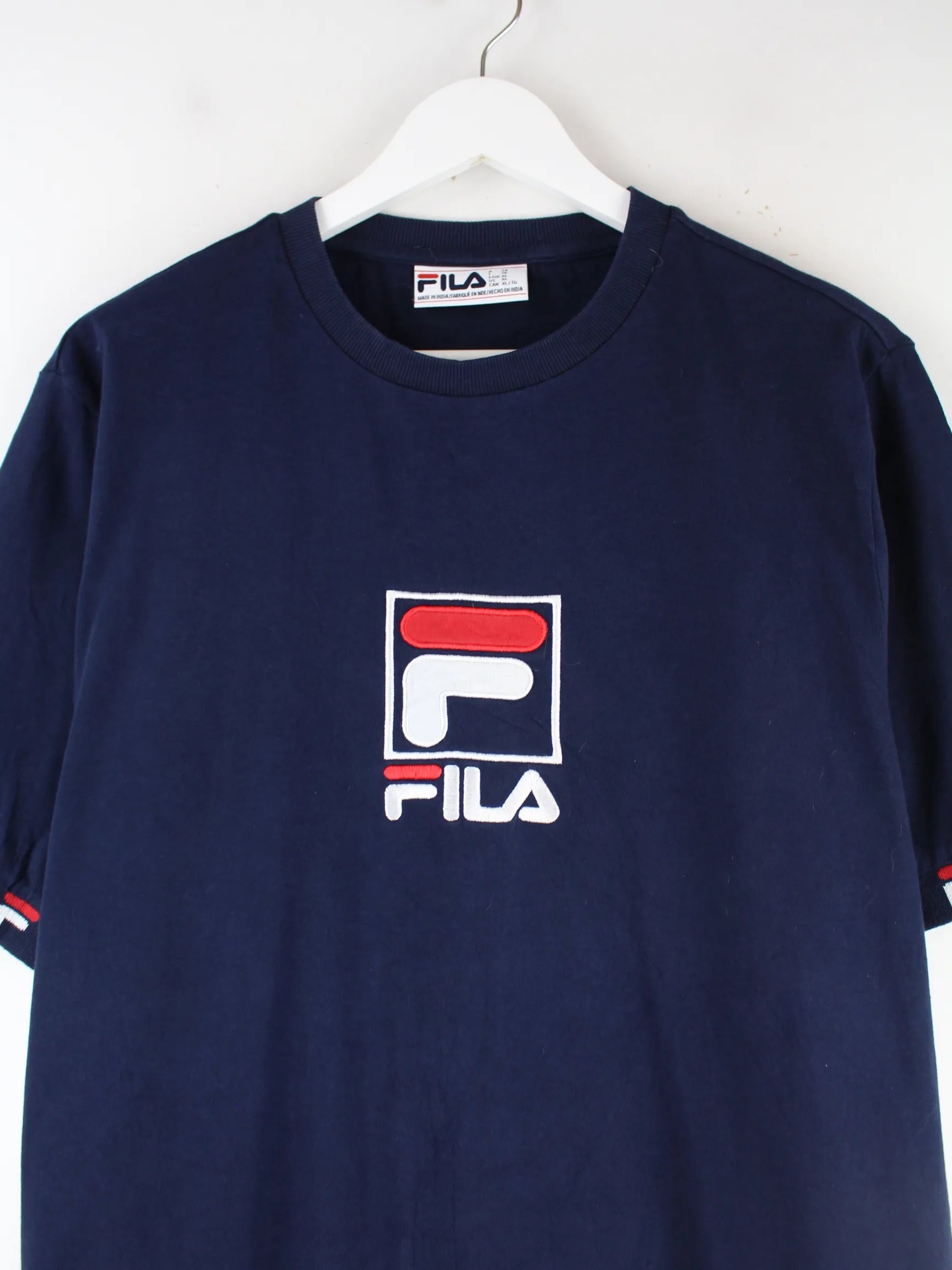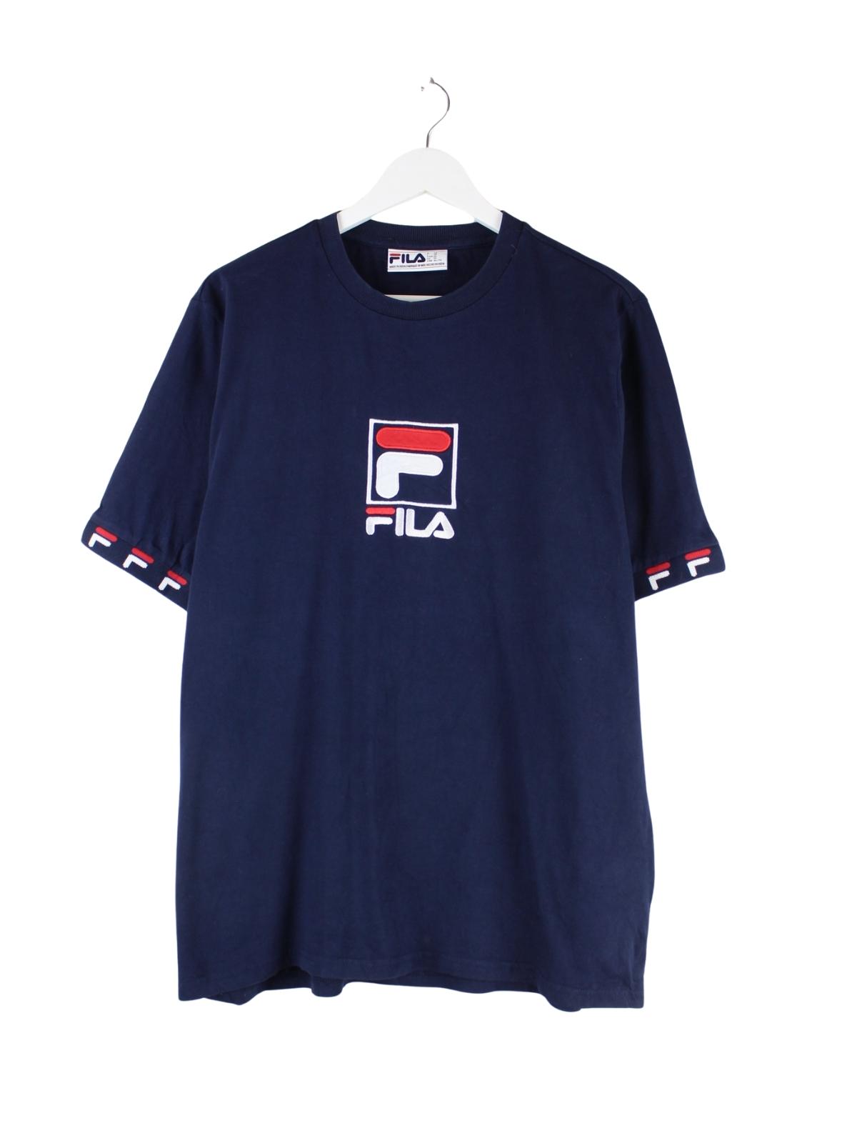 T-Shirt der Brand Fila mit gesticktem Logo in Größe XL. Es ist aus Baumwolle produziert und in Blau zu haben.