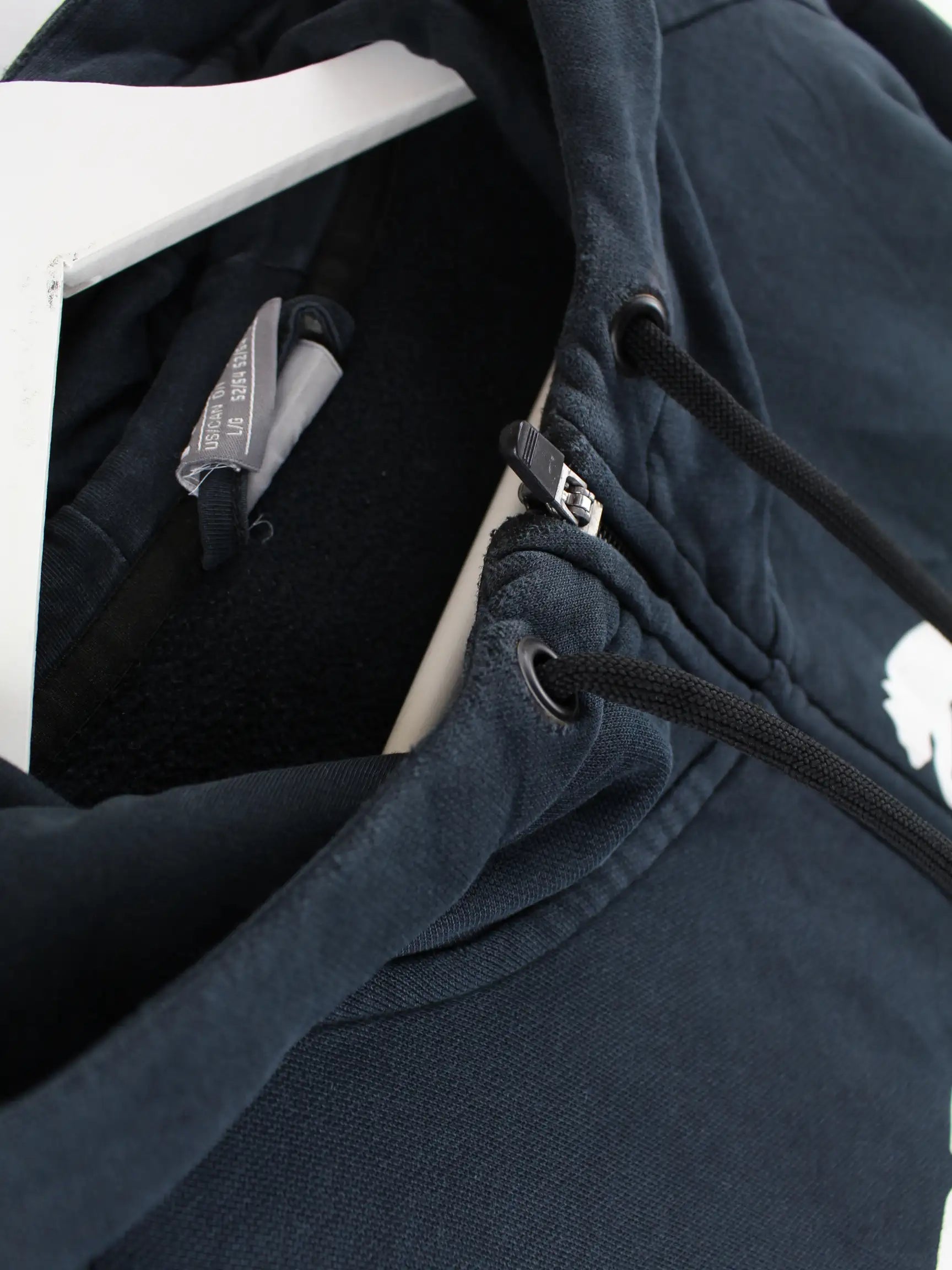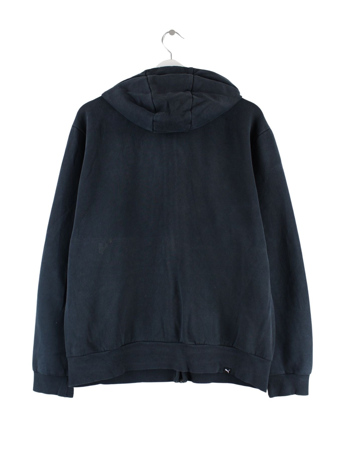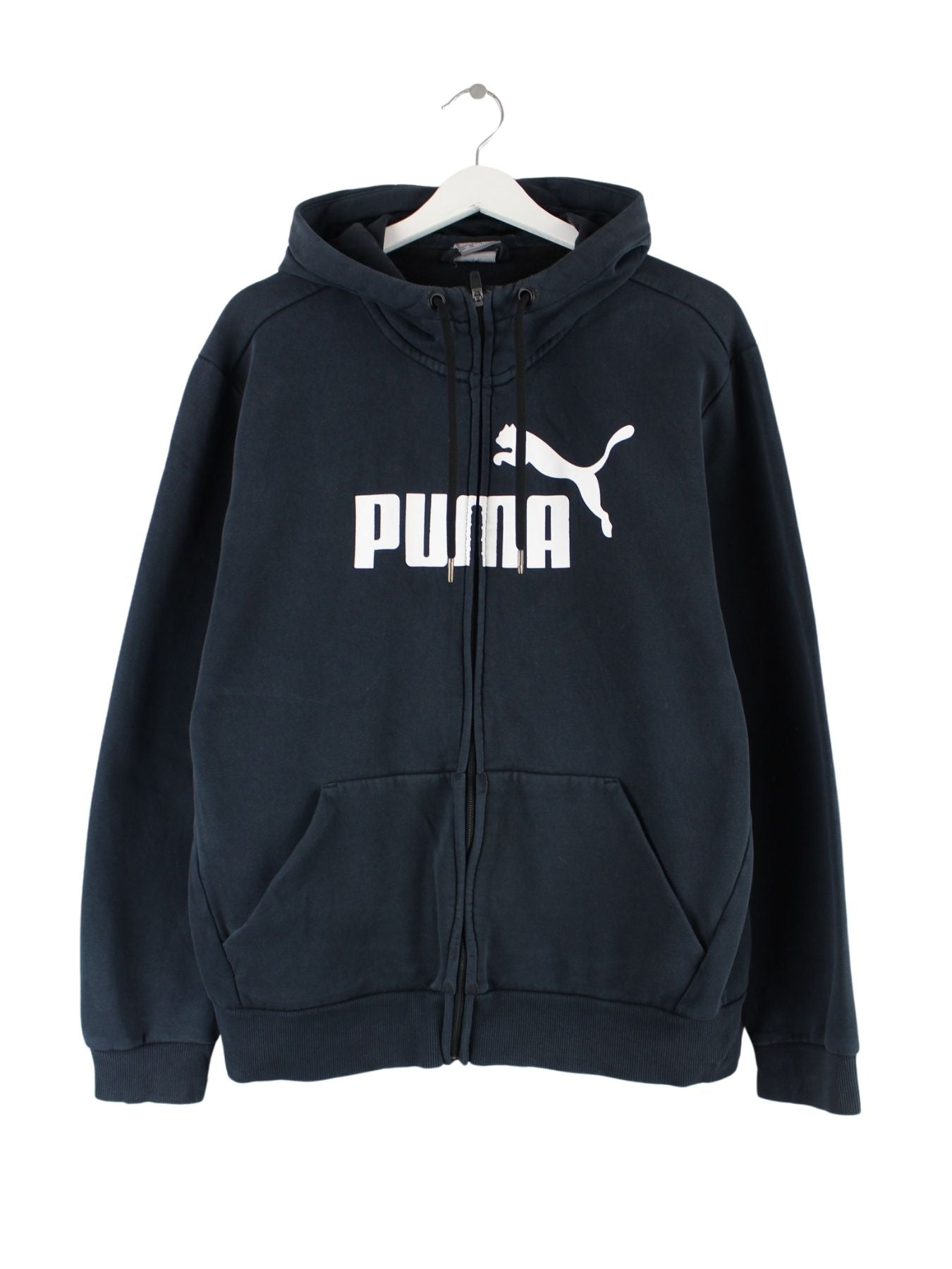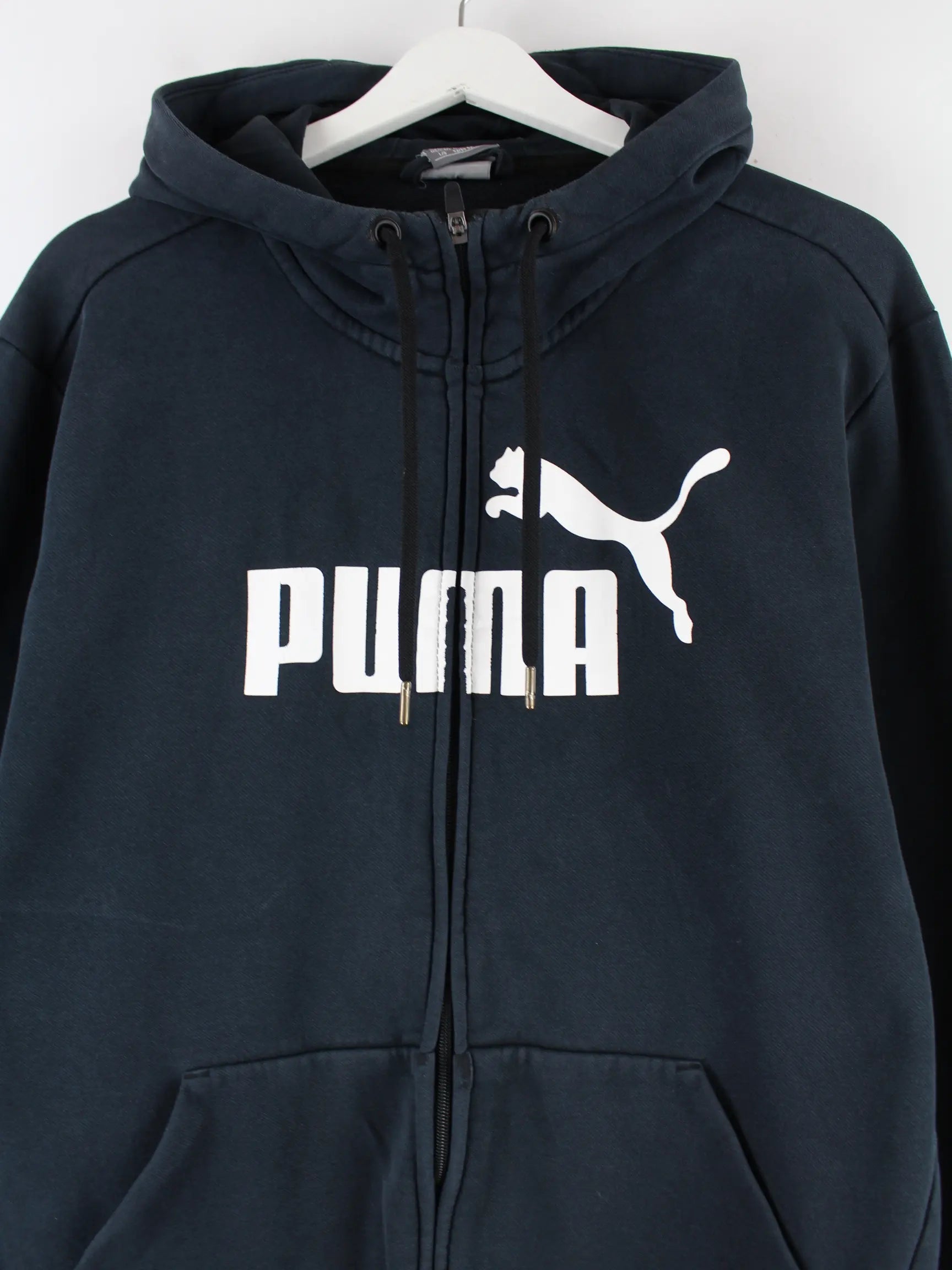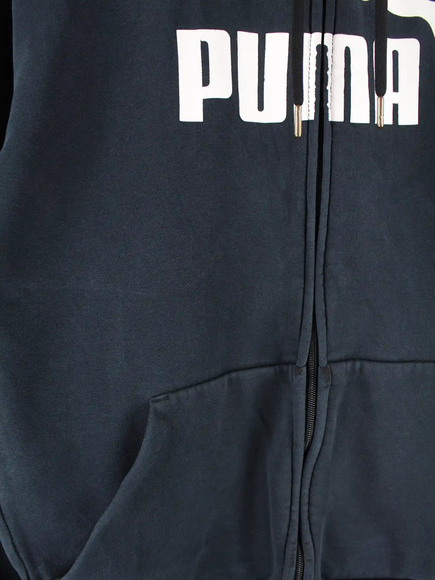Schwarzer Hoodie mit durchgehendem Reißverschluß der Brand Puma in Größe L. Er ist aus einer Baumwollmischung produziert. Den Zustand würden wir als 'In Ordnung' bezeichnen (vergl. Bilder).Mit chiquem undefined Print.