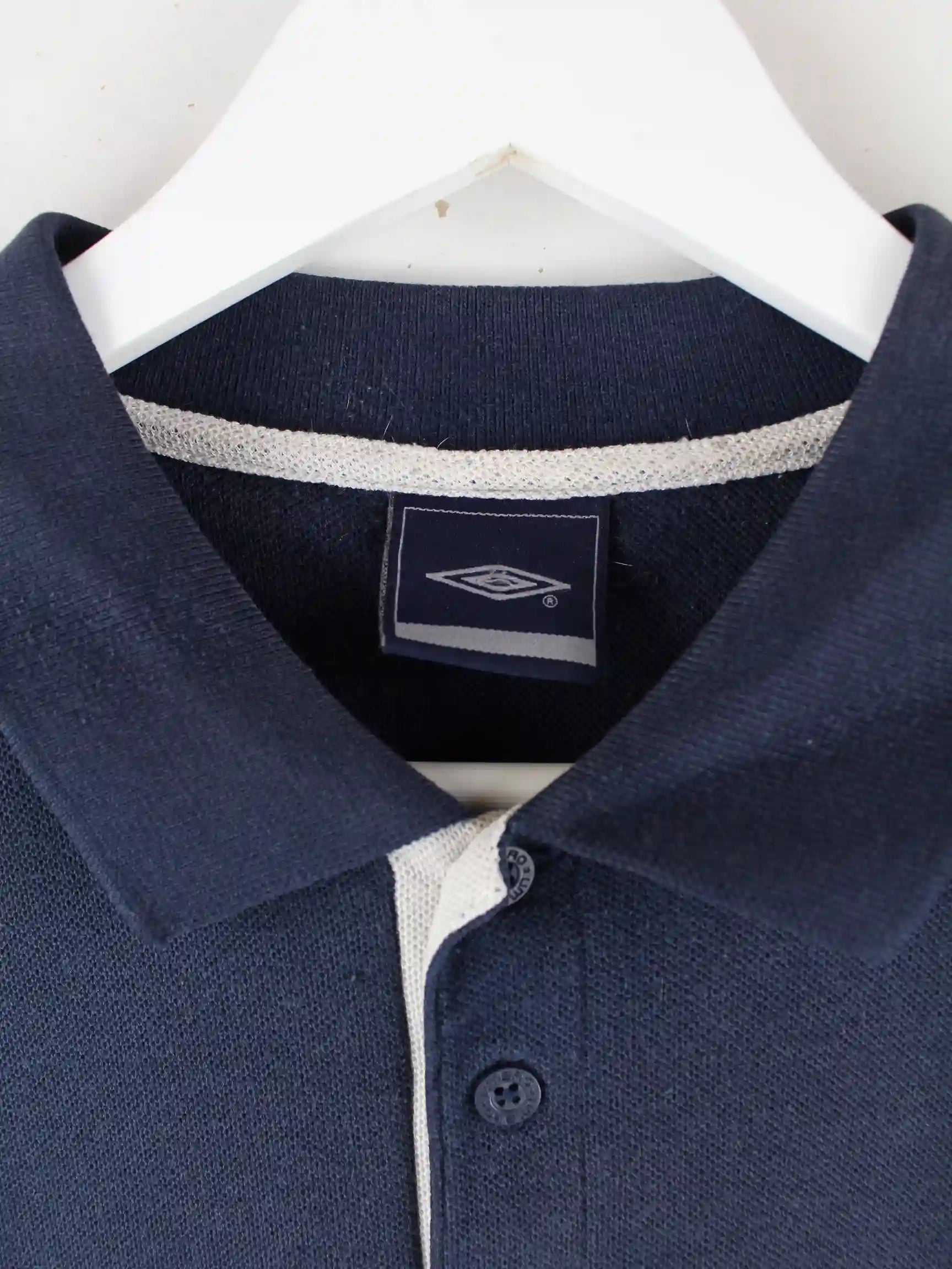 Poloshirt der Marke Umbro in Größe L. Es ist aus Baumwolle gefertigt und in Blau zu bekommen.