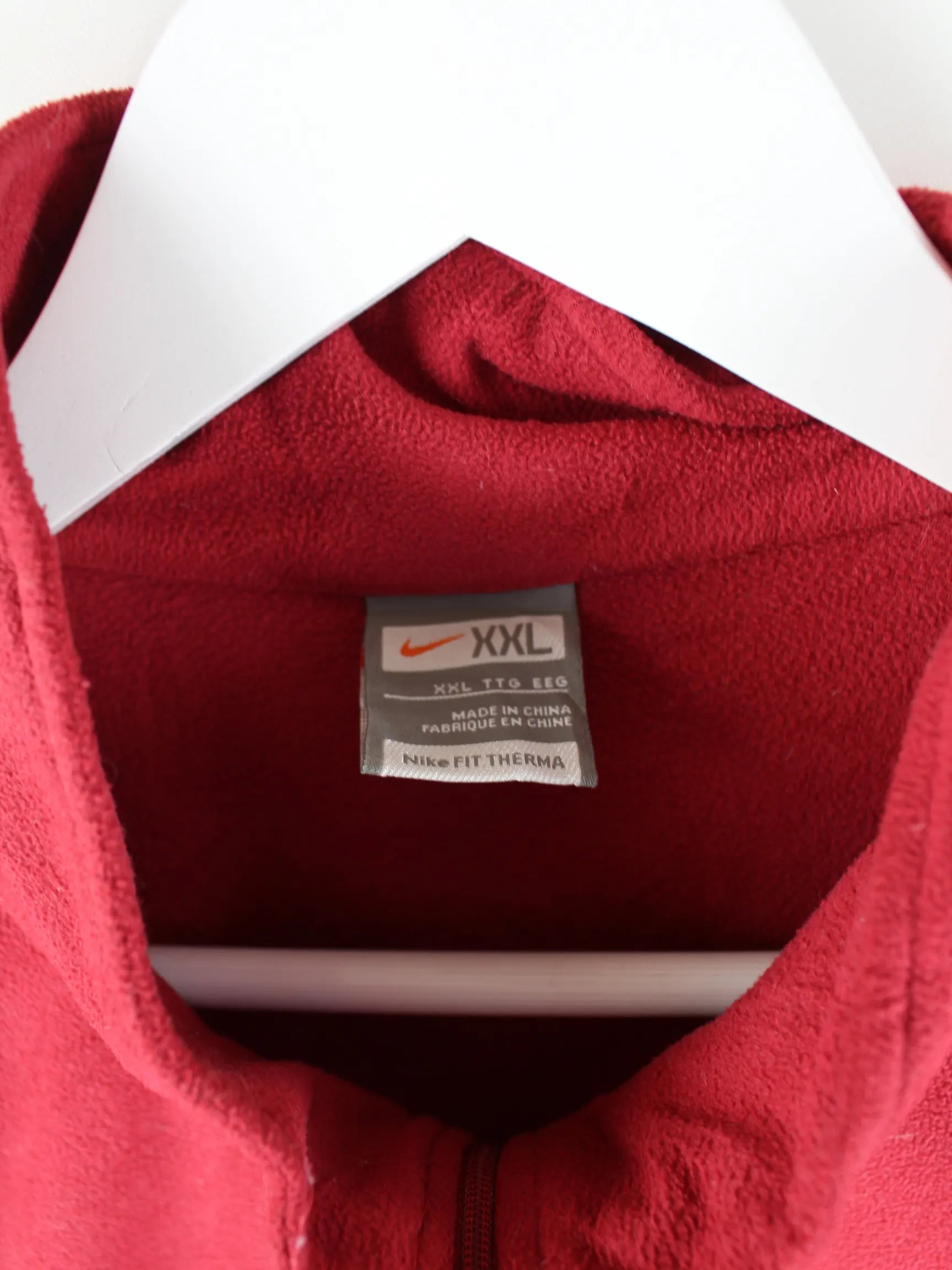 Leichte Jacke des Labels Nike mit kurzem Reißverschluß in Größe XXL. Sie ist aus angenehmem Fleece und in Rot auf Lager.
