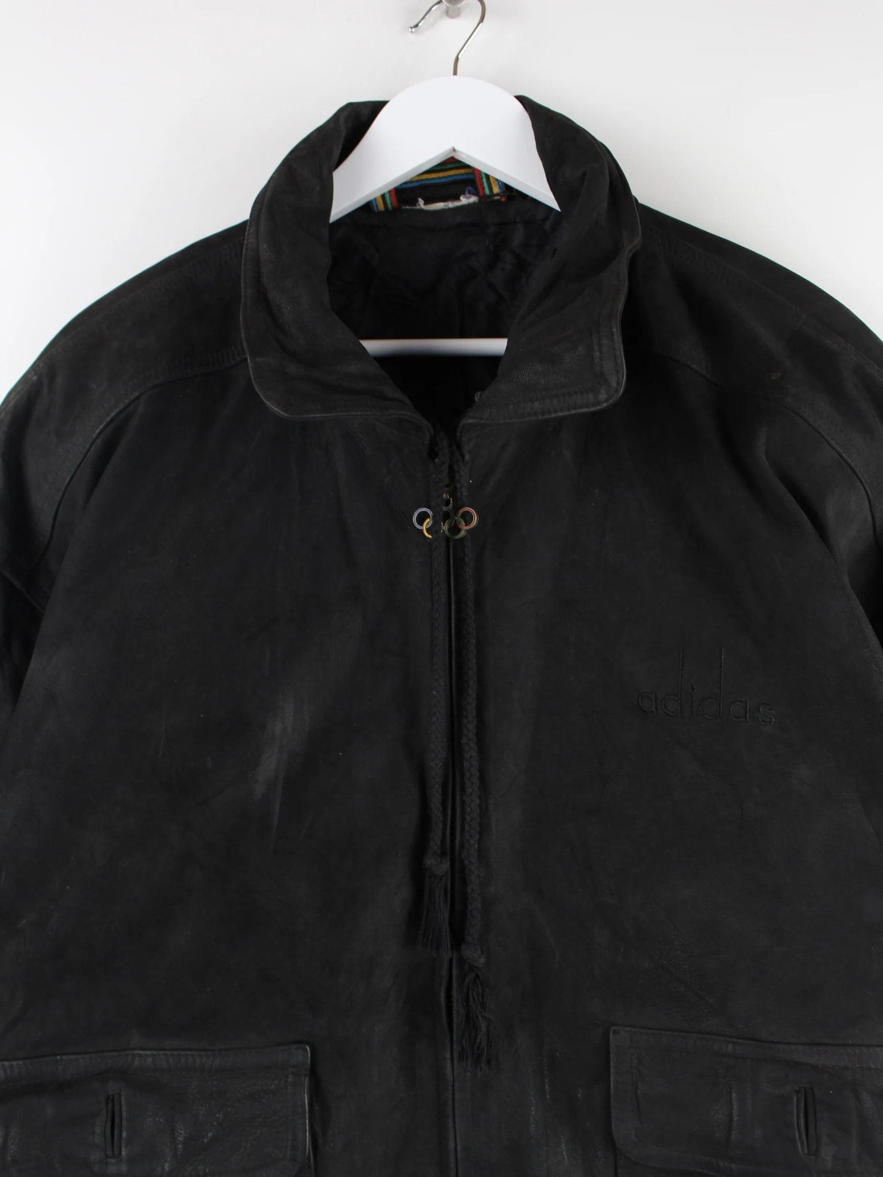 Jacke der Brand Adidas in Größe XL. Sie ist aus Leder hergestellt und in Schwarz zu haben.