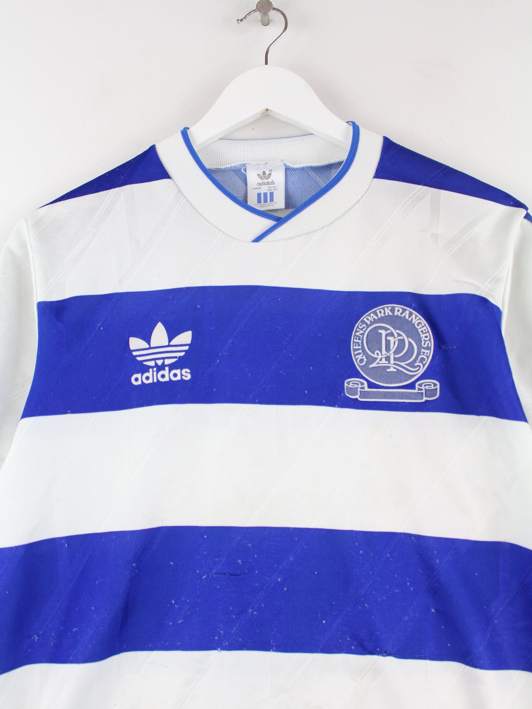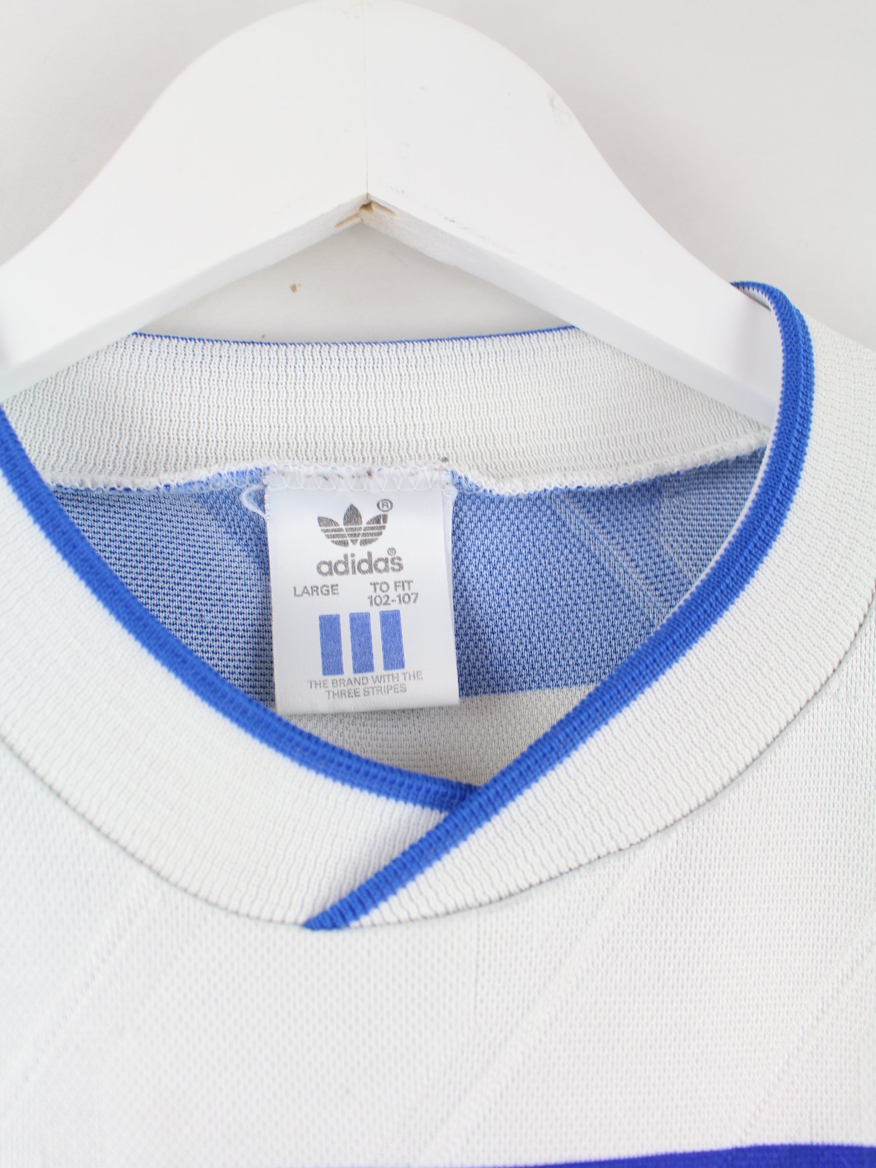 Blue jersey by Adidas from the 80's in size . It is made of synthetic material. We would describe the condition as 'fine' (see pictures).