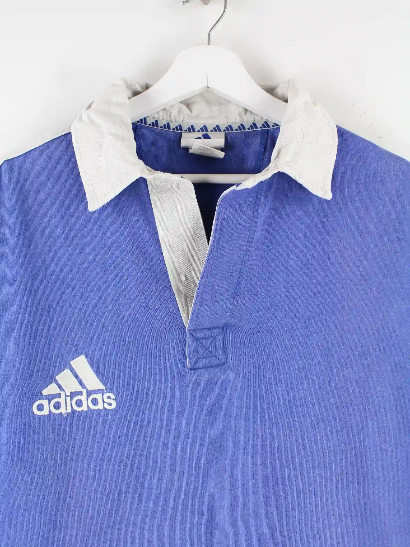 Poloshirt aus dem Hause Adidas in Größe L aus den 90'ern. Es ist aus Baumwolle hergestellt und in Blau auf Lager.