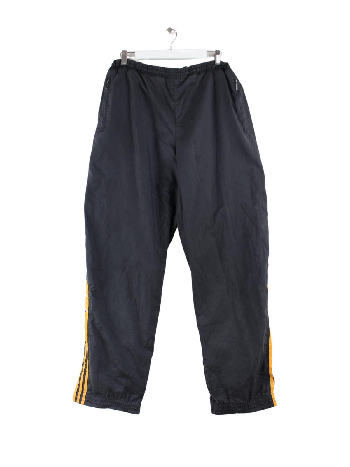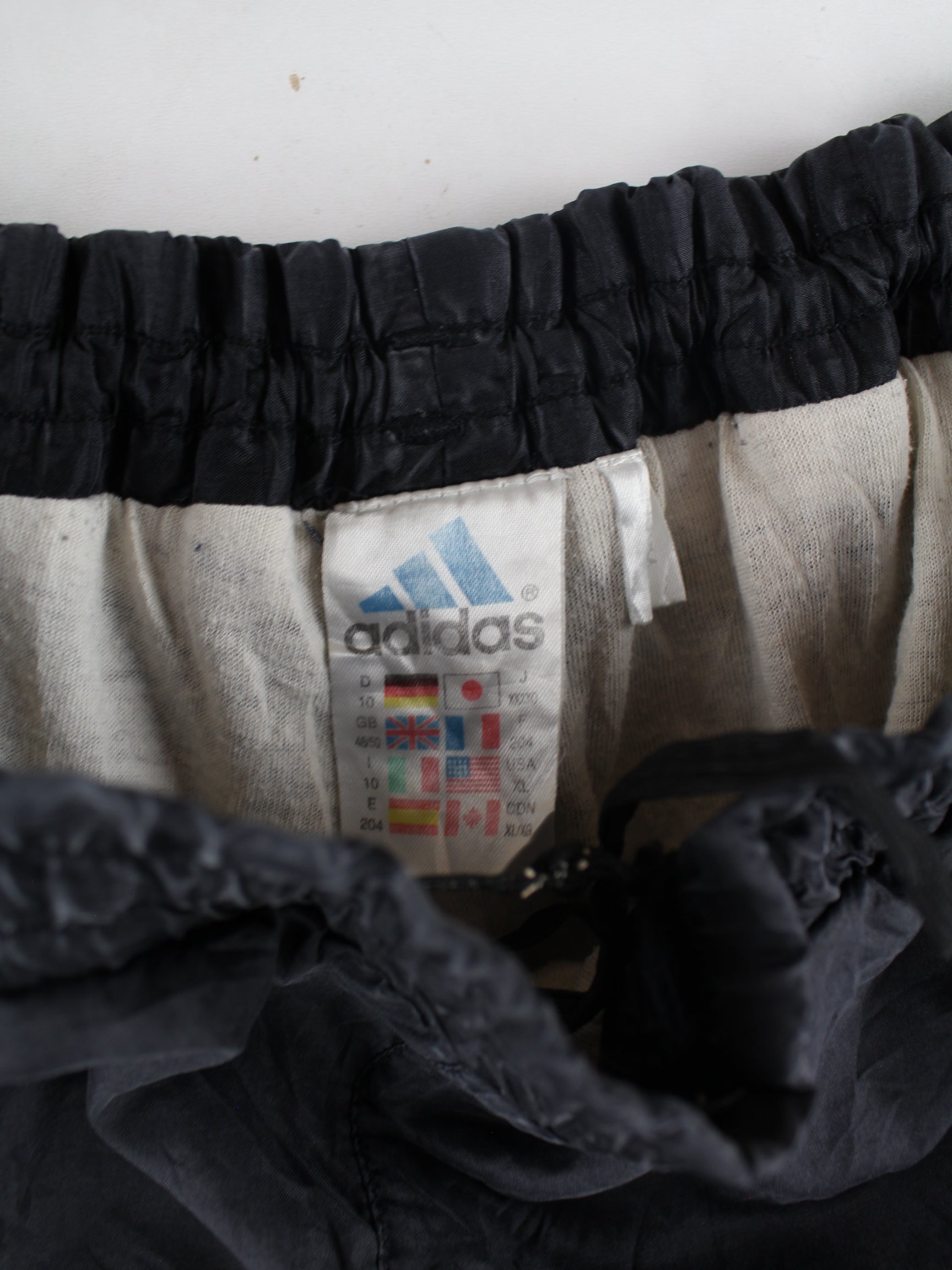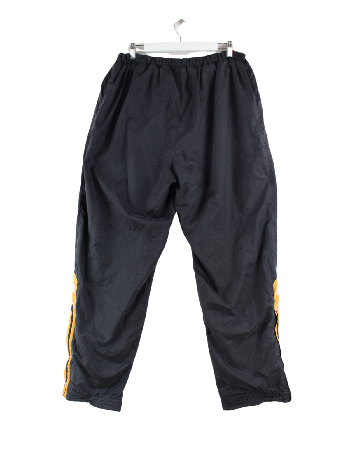 Black track pants with embroidered motifs from the Adidas label from the 90's in size XXL. They are made of synthetic material and are in very good condition in stock.