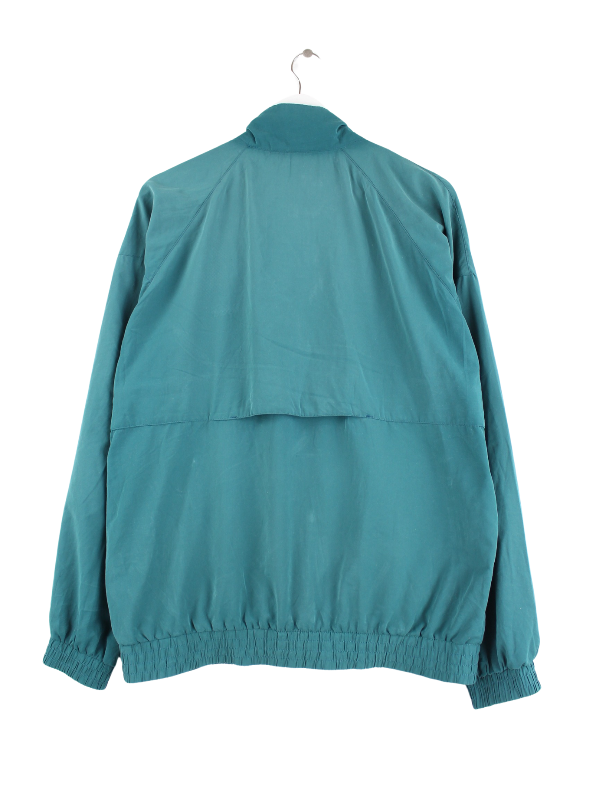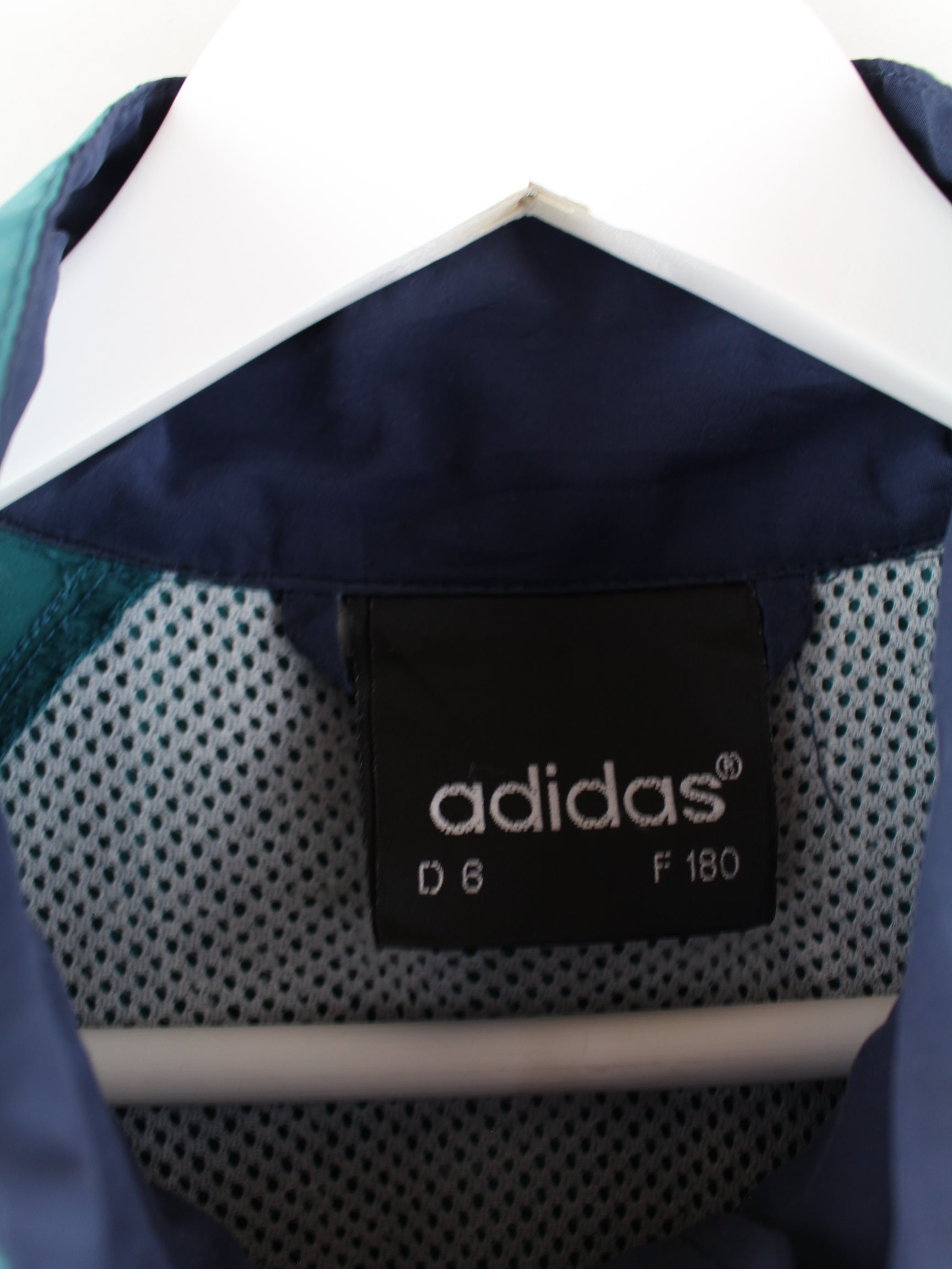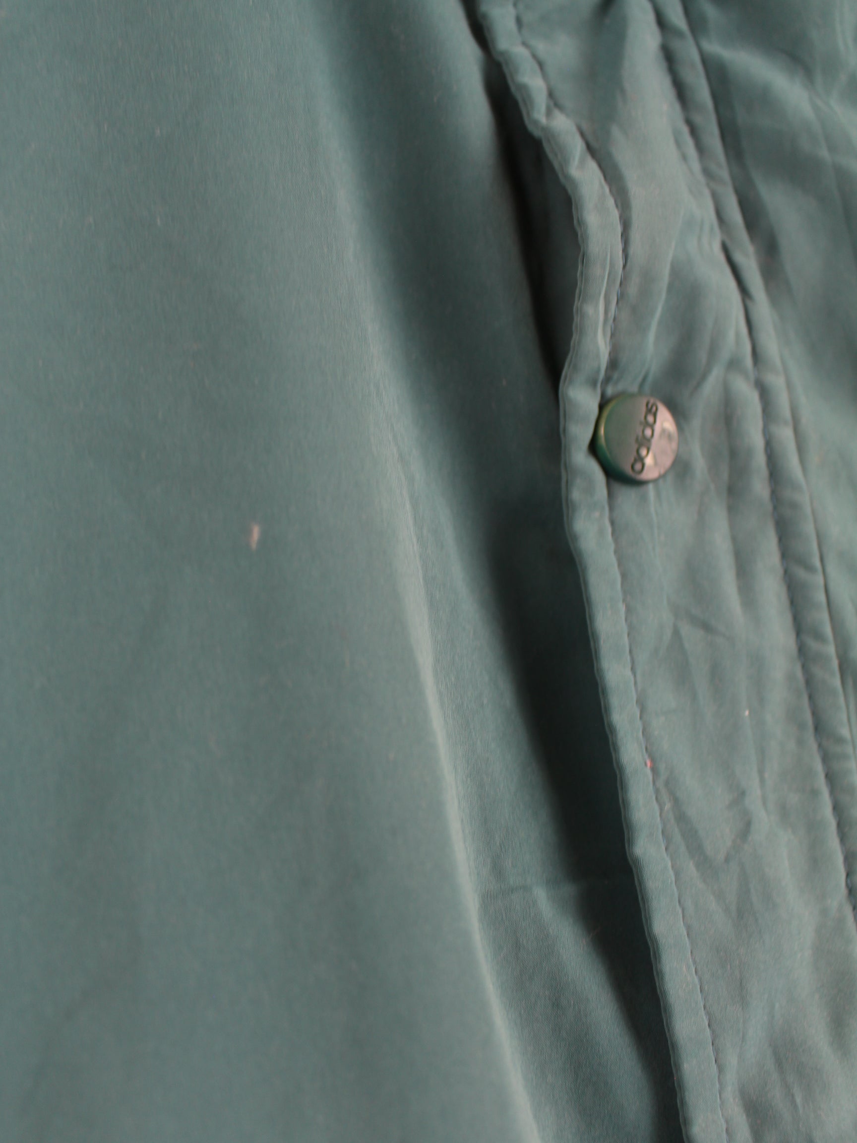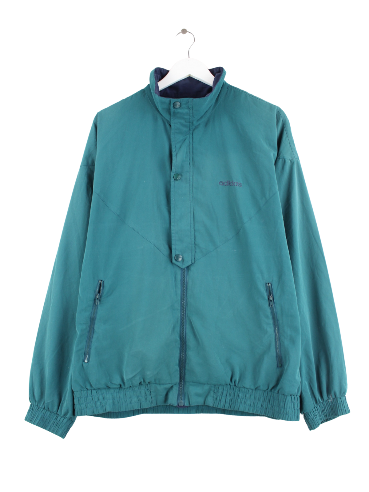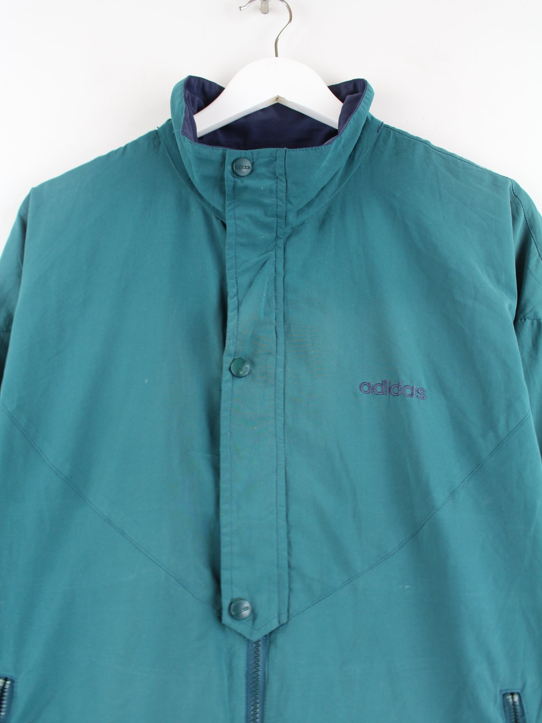 Tracksuit jacket from the Adidas label with embroidered logo in size XL from the 90's. It is made of synthetic material and is in stock in green.