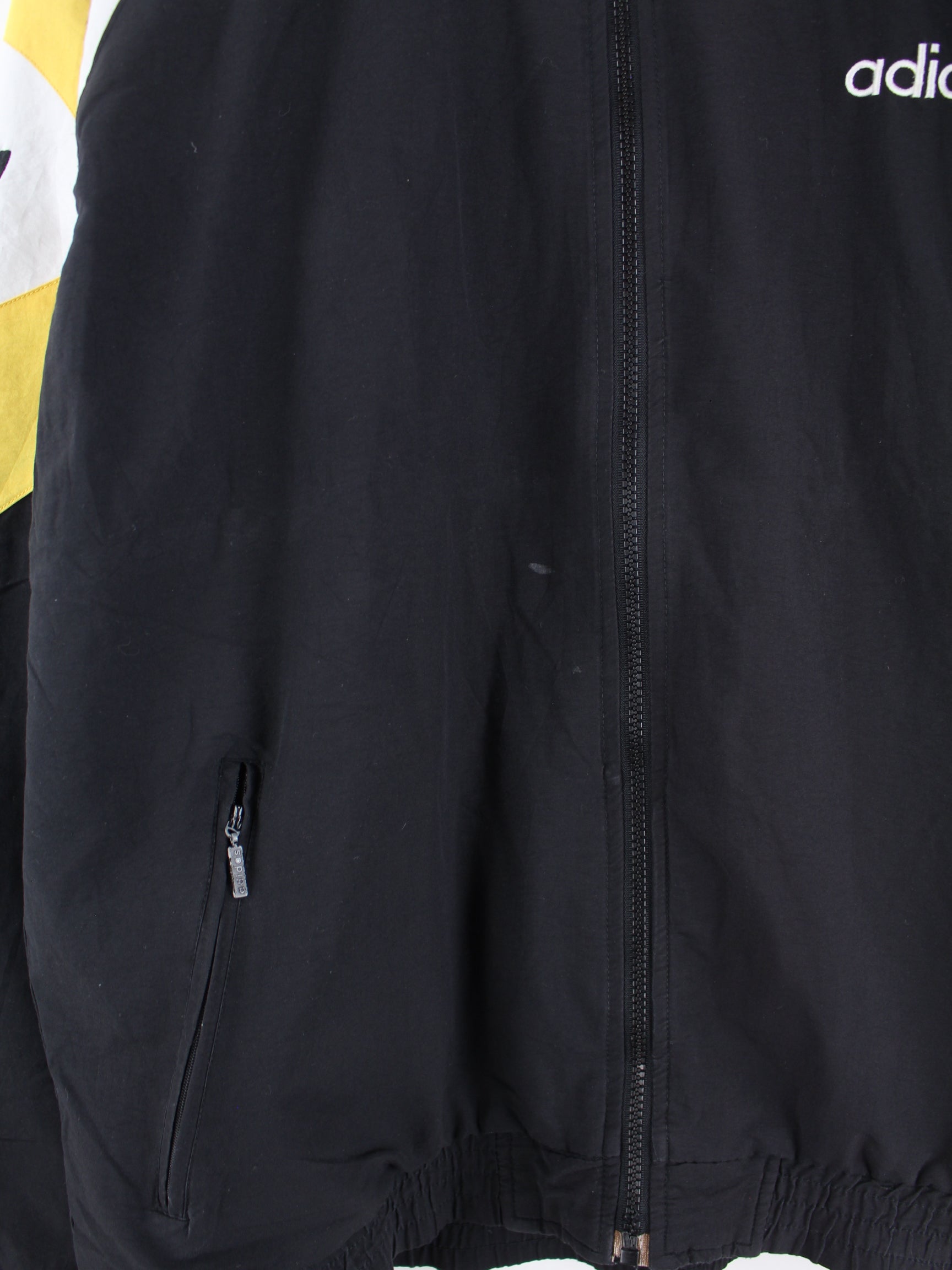 Trainingsjacke des Labels Adidas mit Stick in Größe XXL aus den 90'ern. Sie ist aus Synthetik und in Schwarz zu haben.