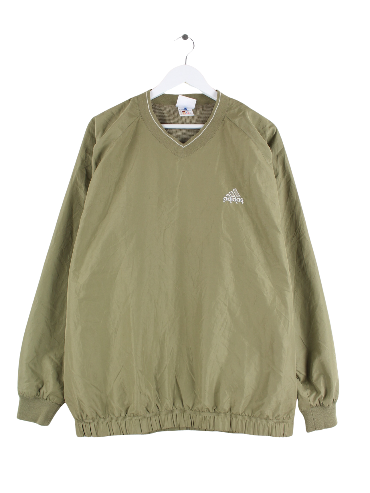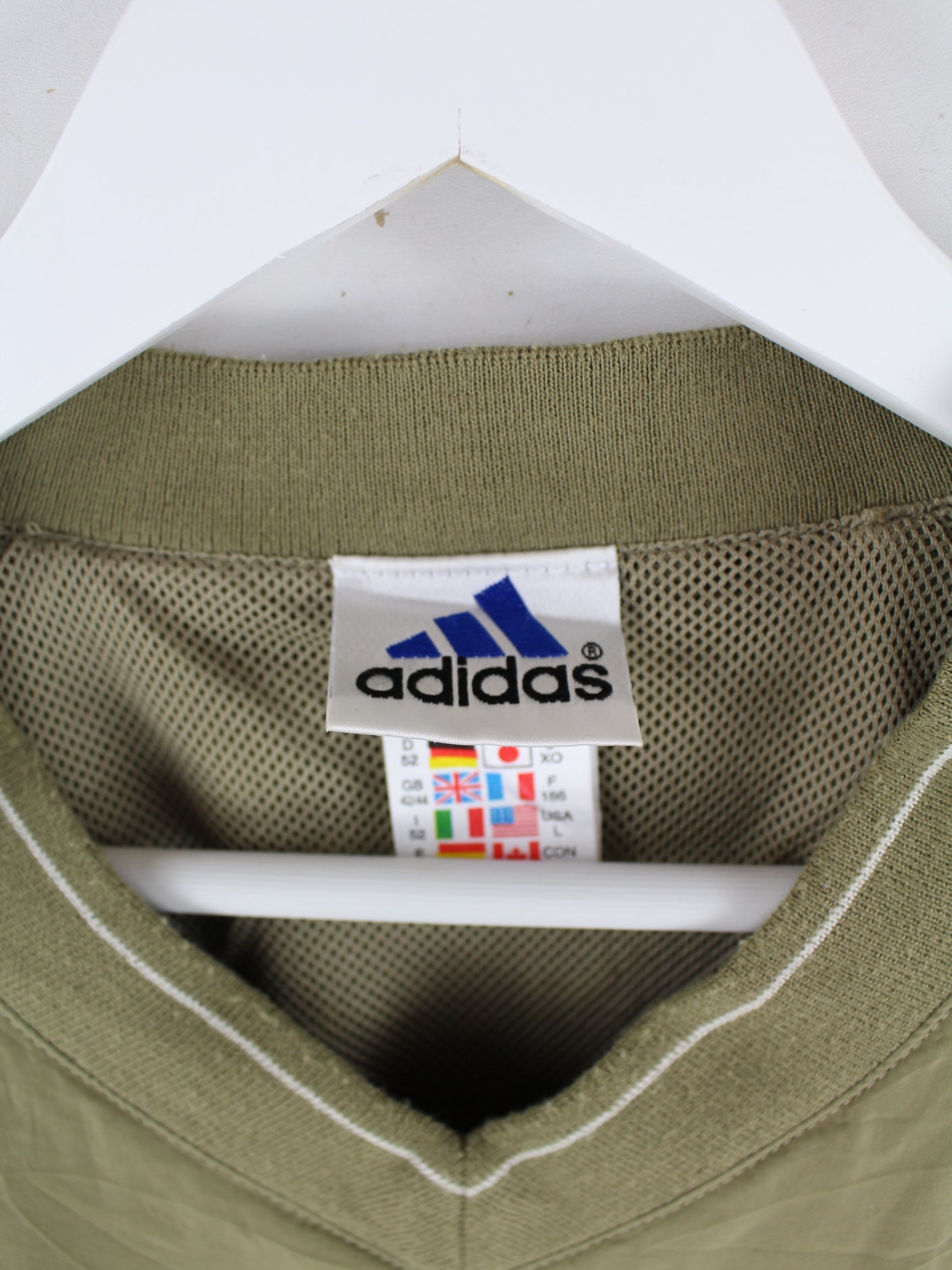 Khakifarbener Sweater aus dem Hause Adidas aus den 90'ern in Größe XL. Er ist aus Synthetik gemacht und in sehr gutem Zustand zu bekommen.