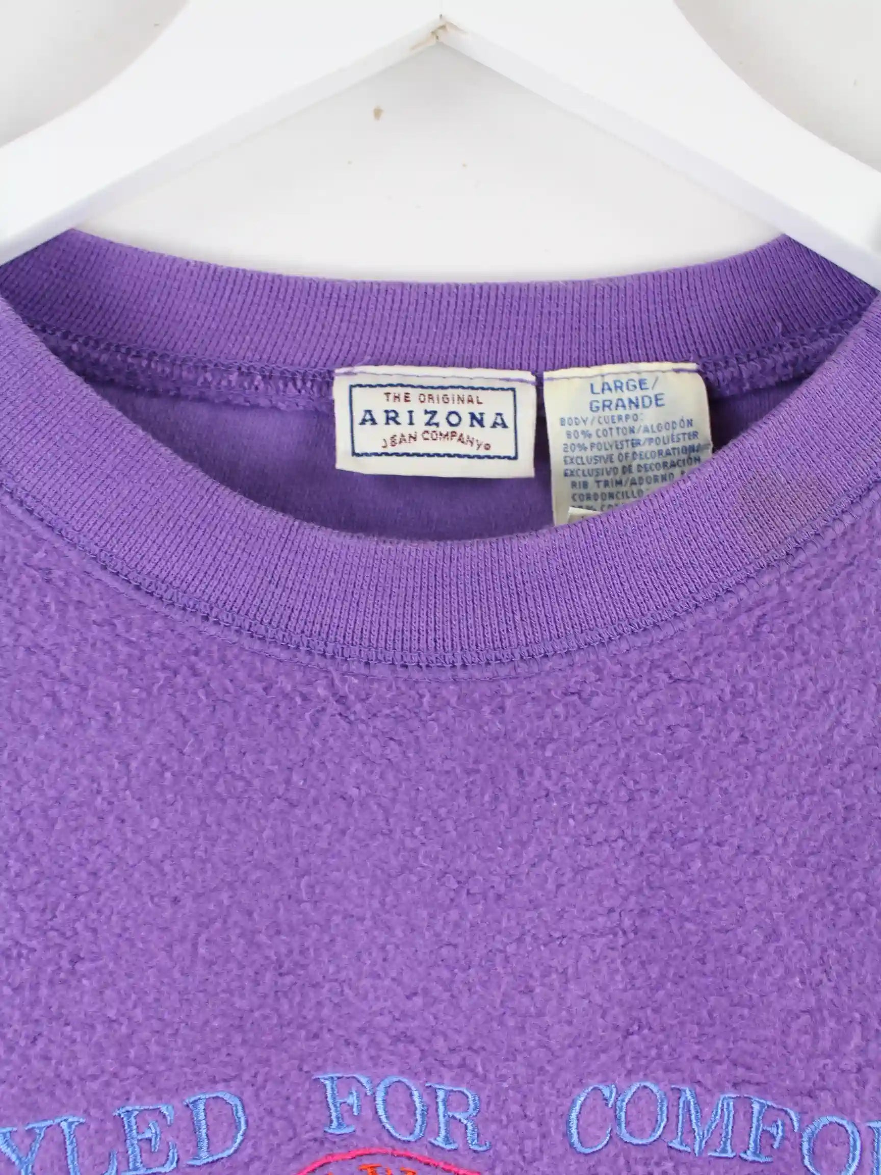Lilafarbener Sweater von Arizona aus den 90'ern in Größe L. Er ist aus einer Baumwollmischung produziert und in gutem Zustand zu haben.