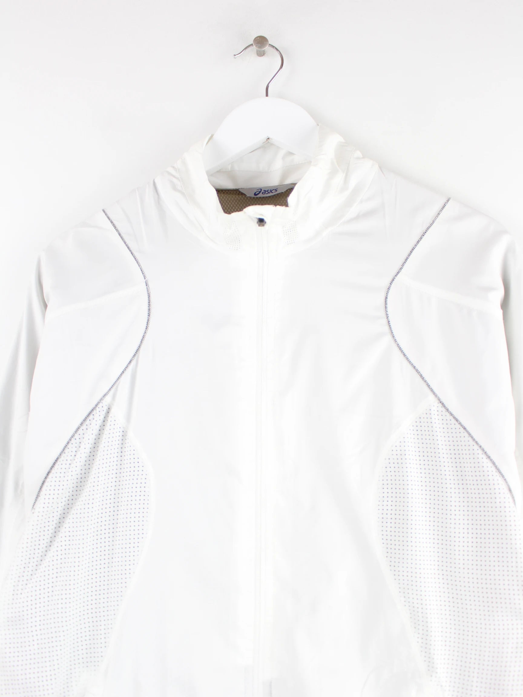 Trainingsjacke vom Label Asics in Größe M. Sie ist aus Synthetik gefertigt und in Weiß lieferbar.