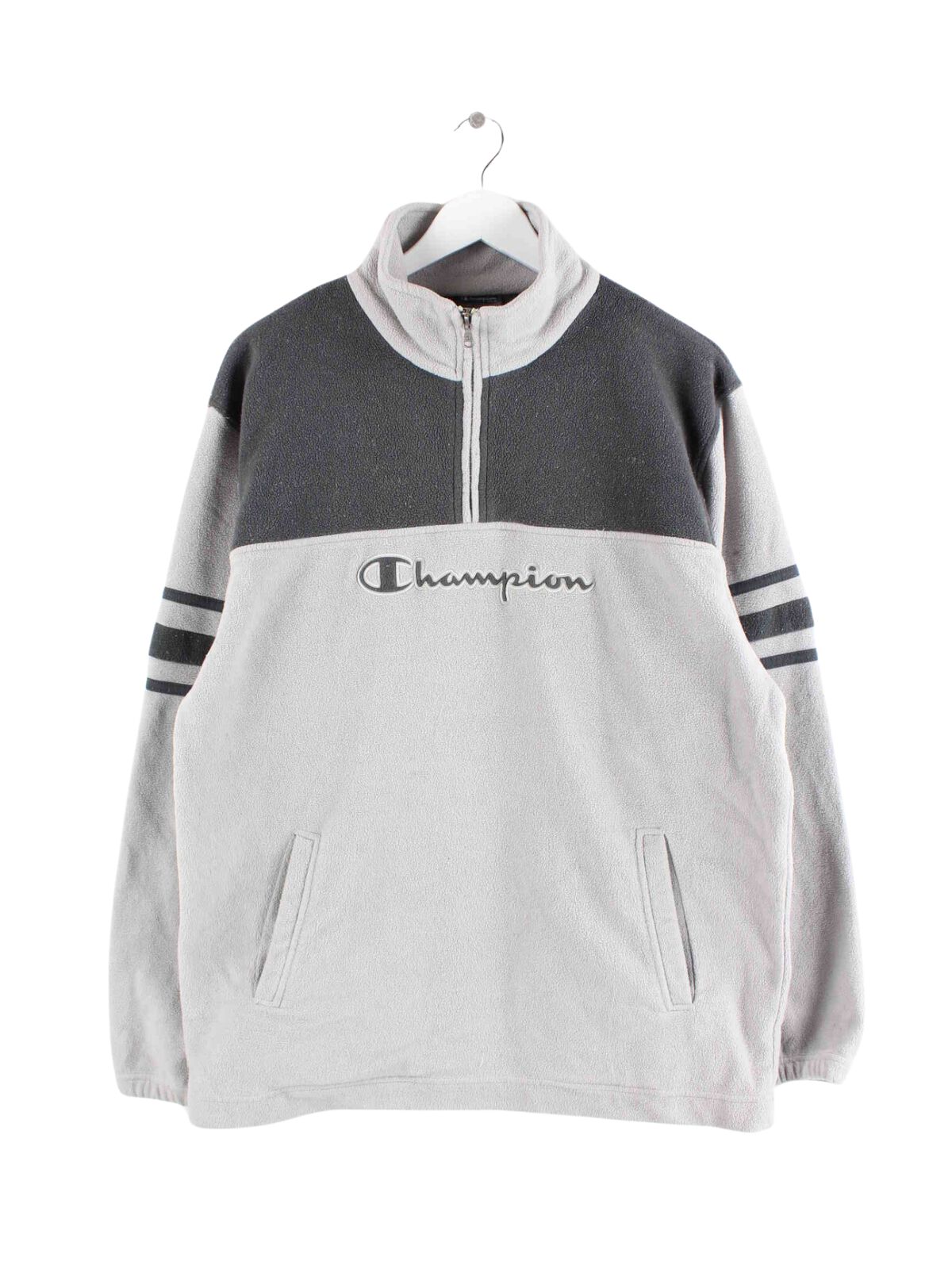 Sweater from the Champion label with an embroidered logo and a short zipper in size L from the early 2000s. It is made of cozy fleece and is available in gray.