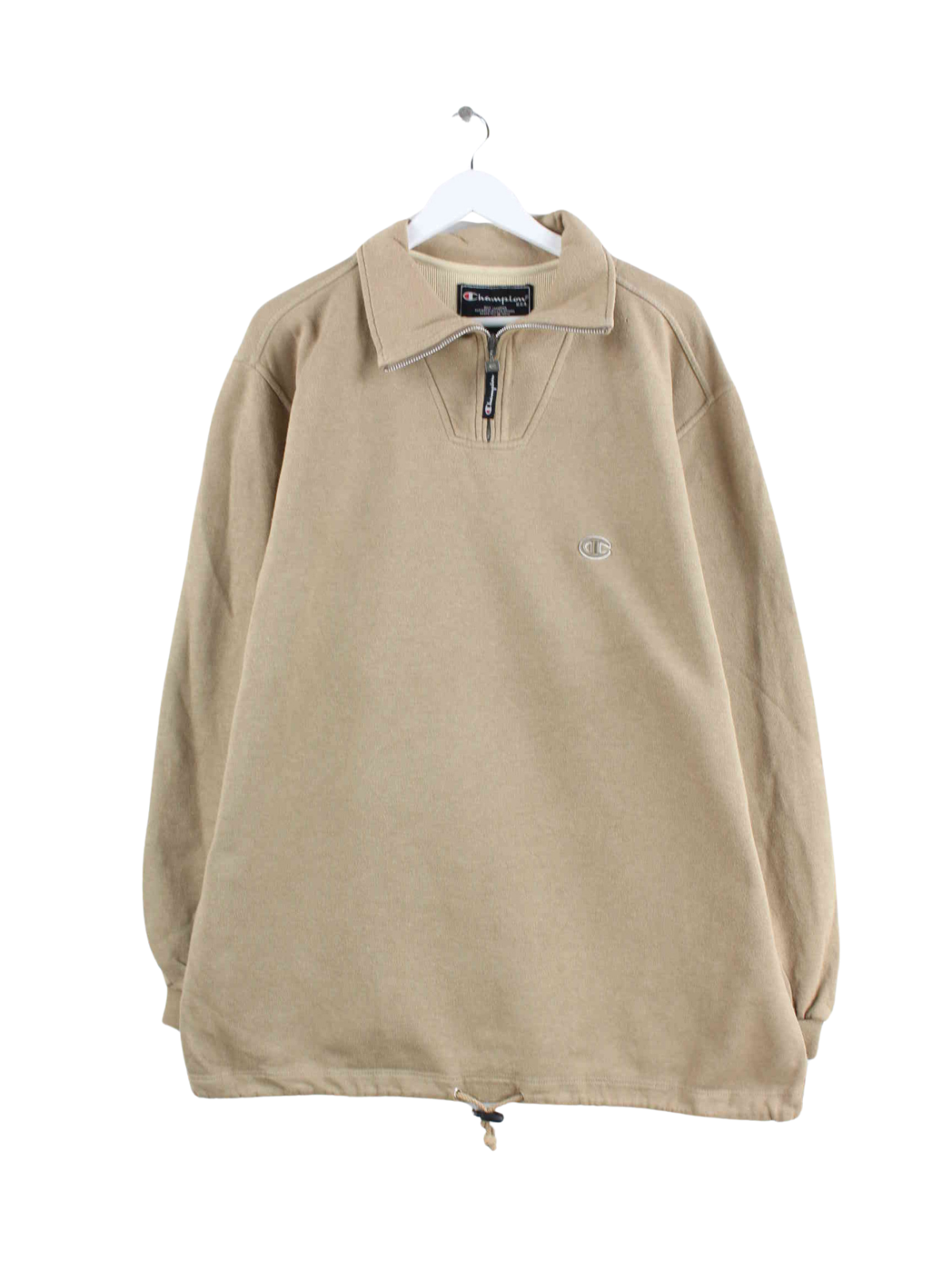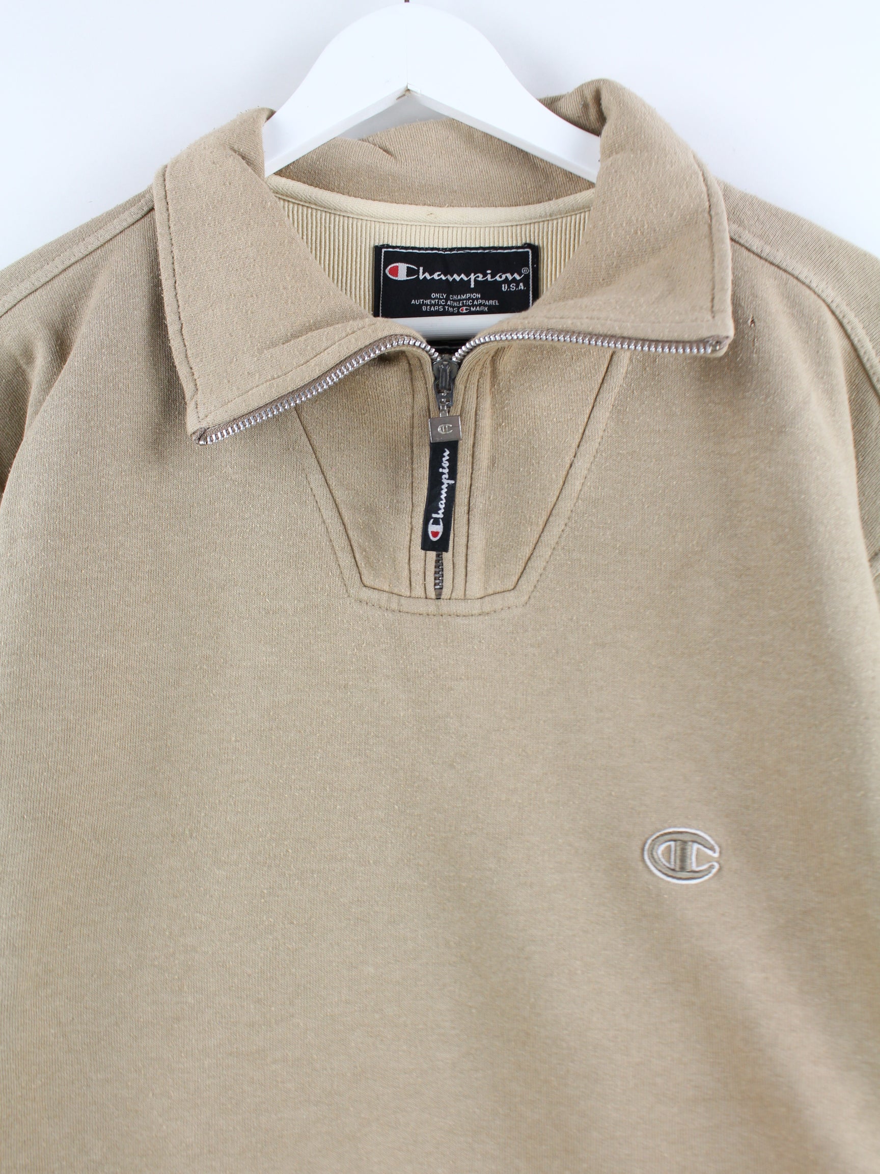 Champion brand sweater with half zip in size L from the early 2000s. It is made of a cotton blend and comes in a brown tone.