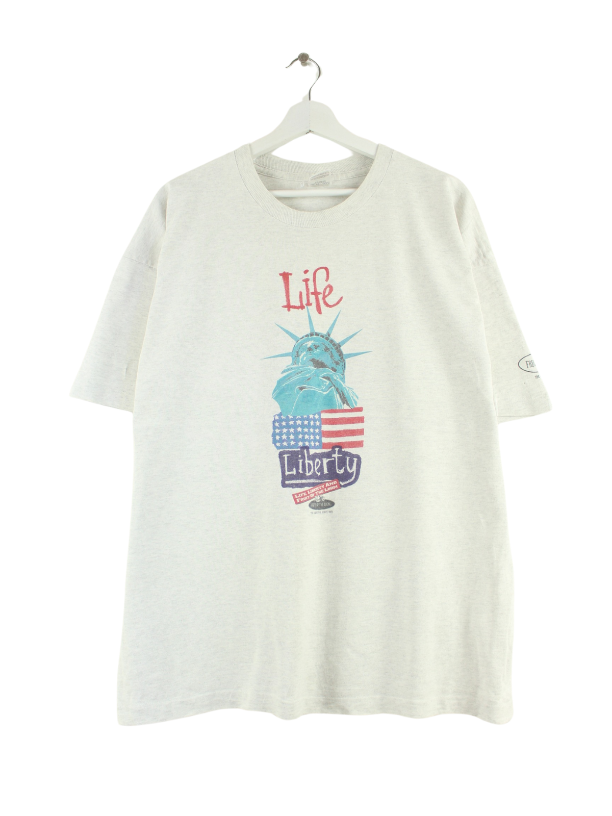 Grey T-shirt from the Fruit of the Loom label from the 80's in size XL. It is made of cotton and in very good condition. With a chic Liberty print.
