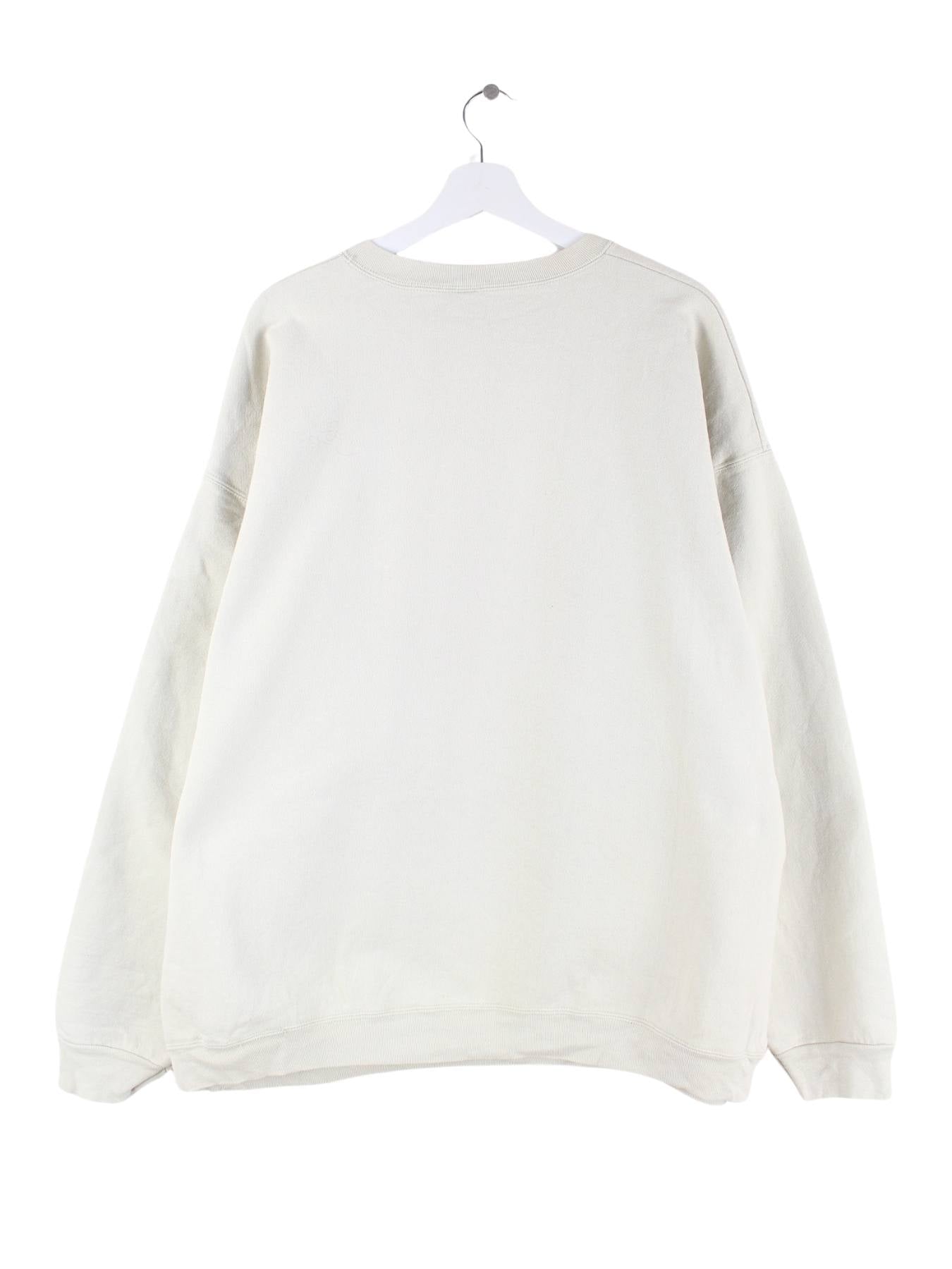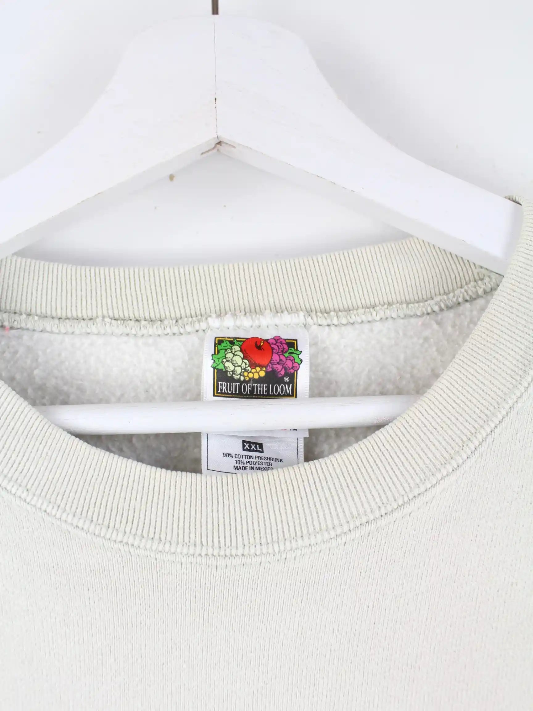 Beigefarbener Sweater mit gestickten Motiven von Fruit of the Loom aus den 90'ern in Größe XXL. Er ist aus einer Baumwollmischung gefertigt und in sehr gutem Zustand vorrätig.