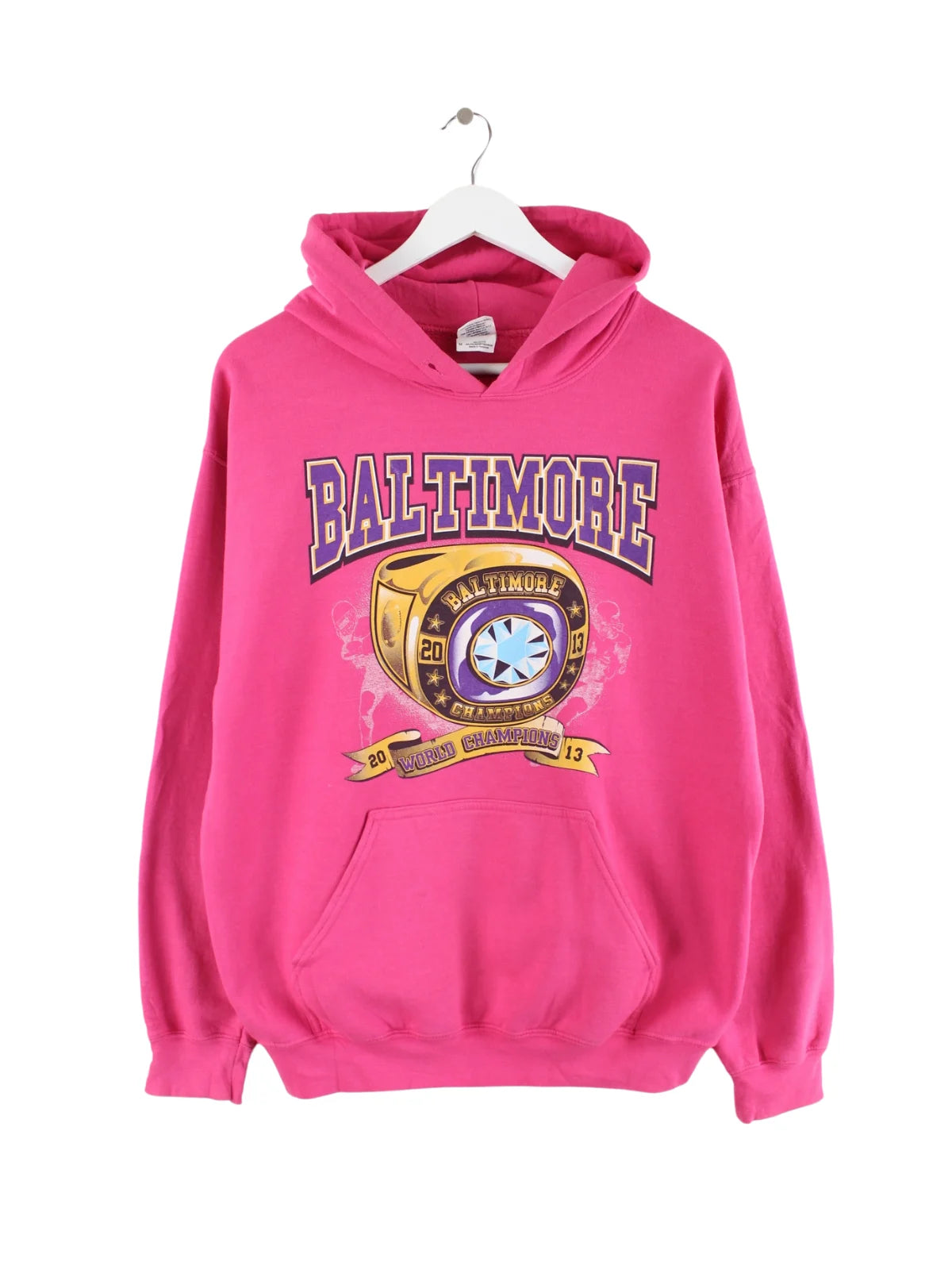 Rosafarbener Hoodie vom Label Gildan in Größe M. Er ist aus einer Baumwollmischung gefertigt und in gutem Zustand auf Lager. Mit seltenem Ravens Print.