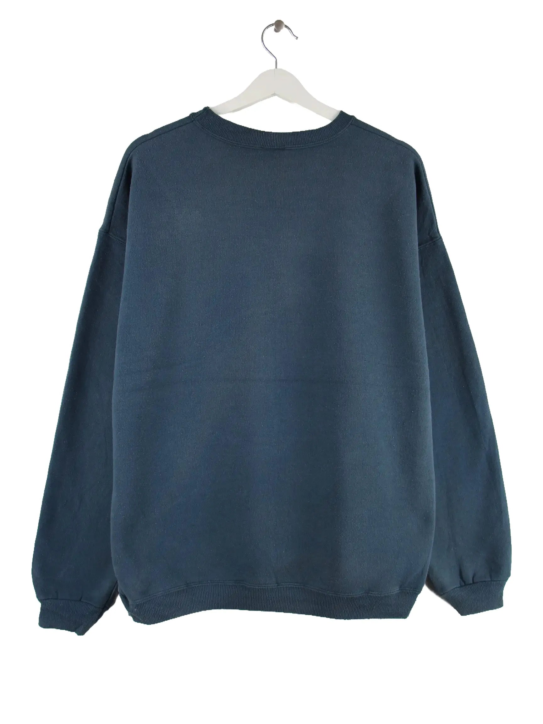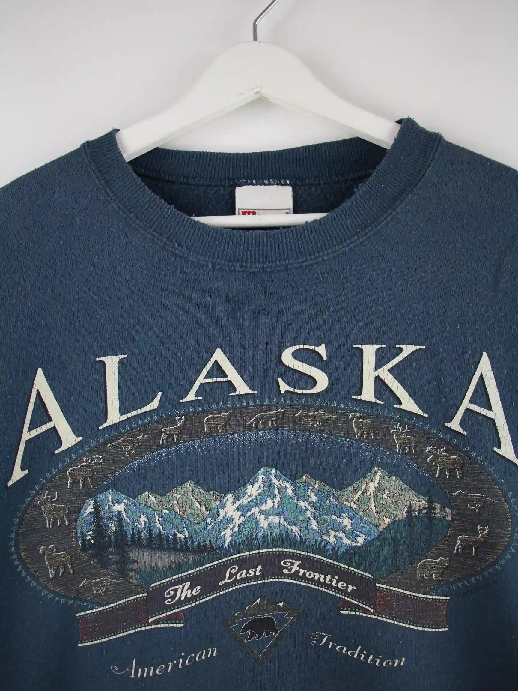 Blauer Sweater aus dem Hause Hanes aus den 90'ern in Größe L. Er ist aus einer Baumwollmischung angefertigt. Den Zustand würden wir als 'In Ordnung' bezeichnen (vergl. Bilder).Mit chiquem Alaska Print.