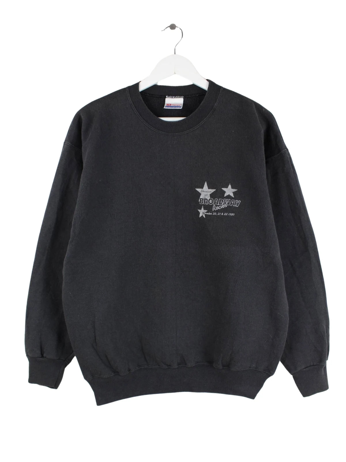 Sweater vom Label Hanes in Größe L aus den 90'ern. Er ist aus einer Baumwollmischung gefertigt und in Schwarz auf Lager. Mit tollem Broadway Print.