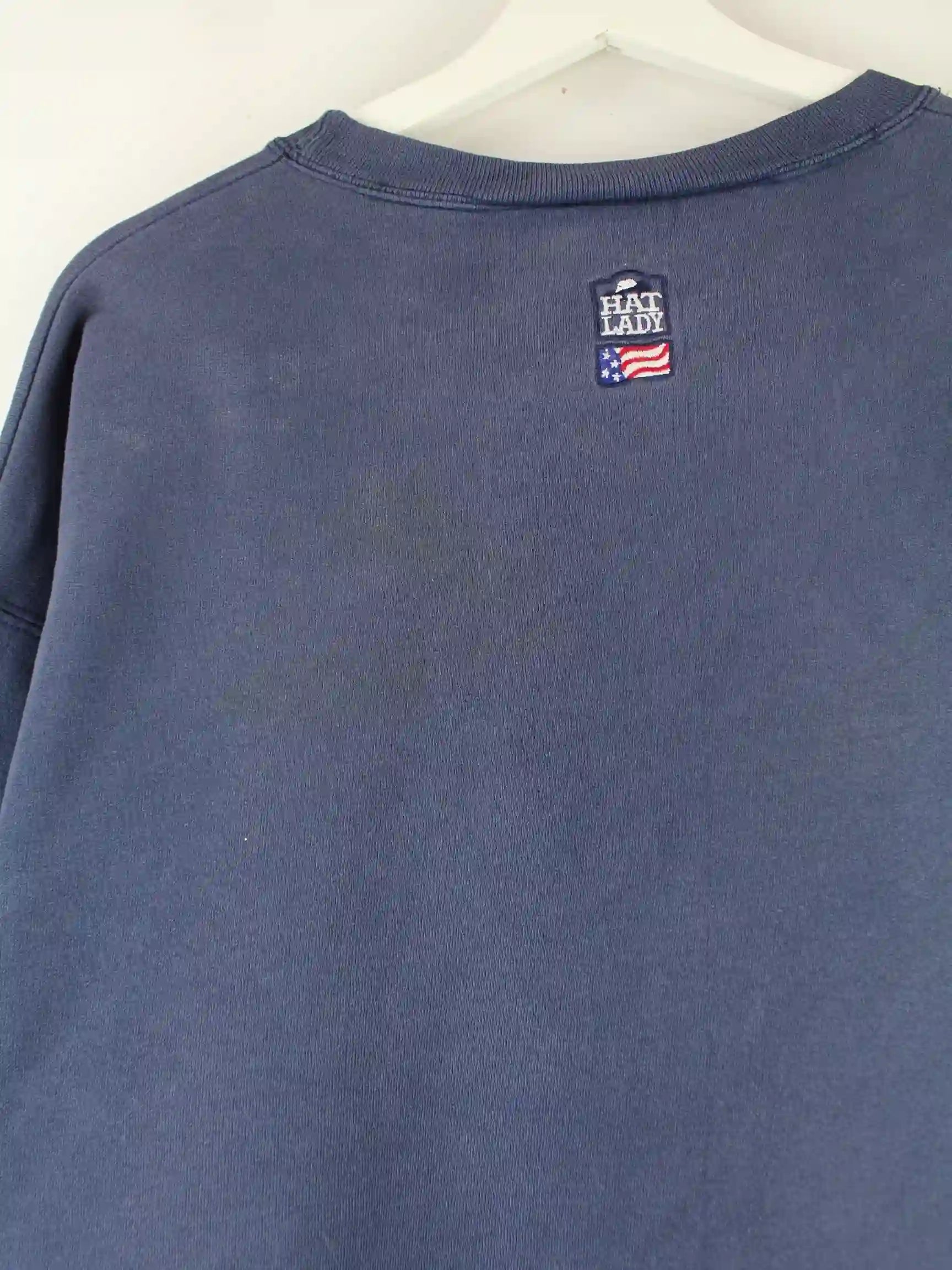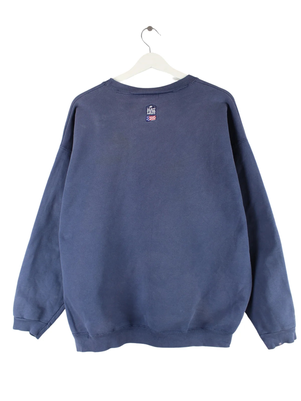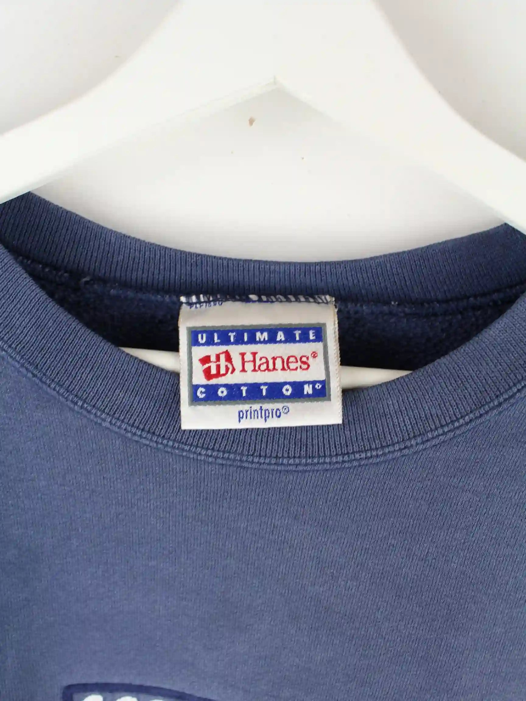 Blauer Sweater mit Stick der Brand Hanes aus den 90'ern in Größe L. Er ist aus einer Baumwollmischung produziert und in gutem Zustand zu haben.