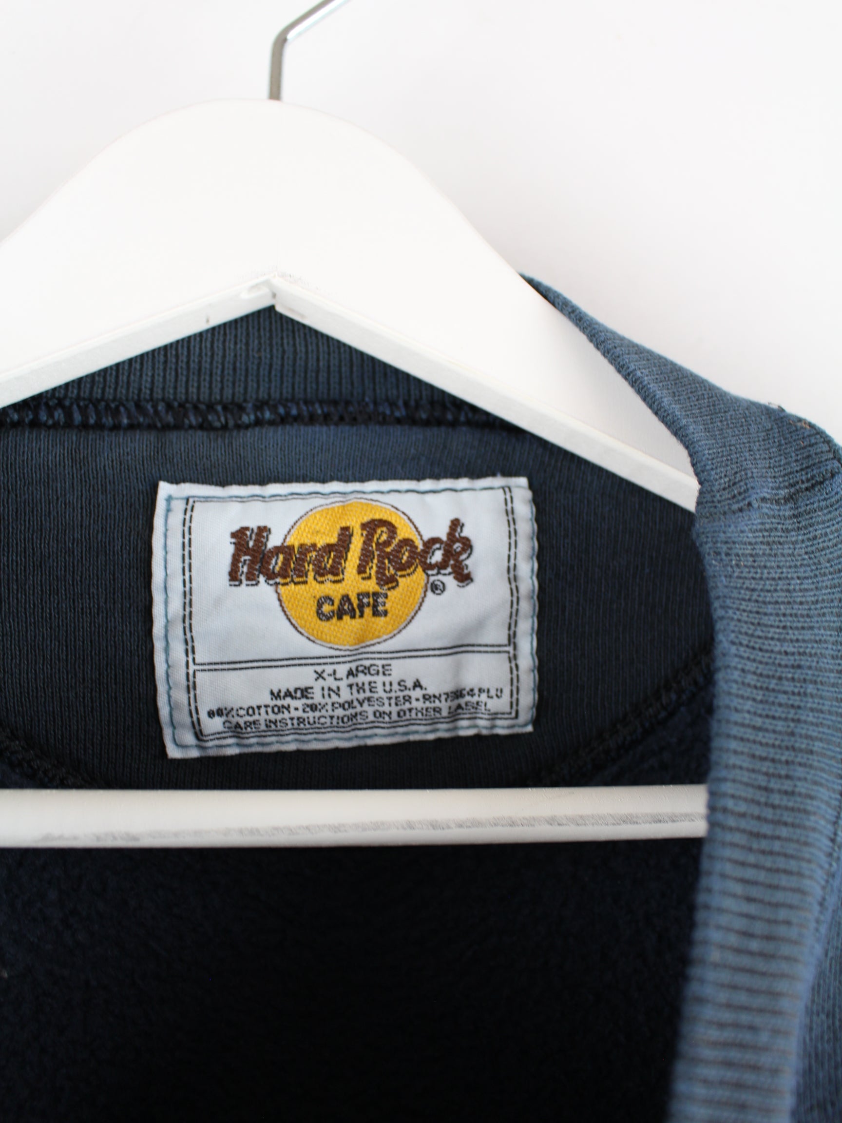 Sweater from the Hard Rock Cafe label with embroidery in size XL from the 90's. It is made from a cotton blend and is available in blue.