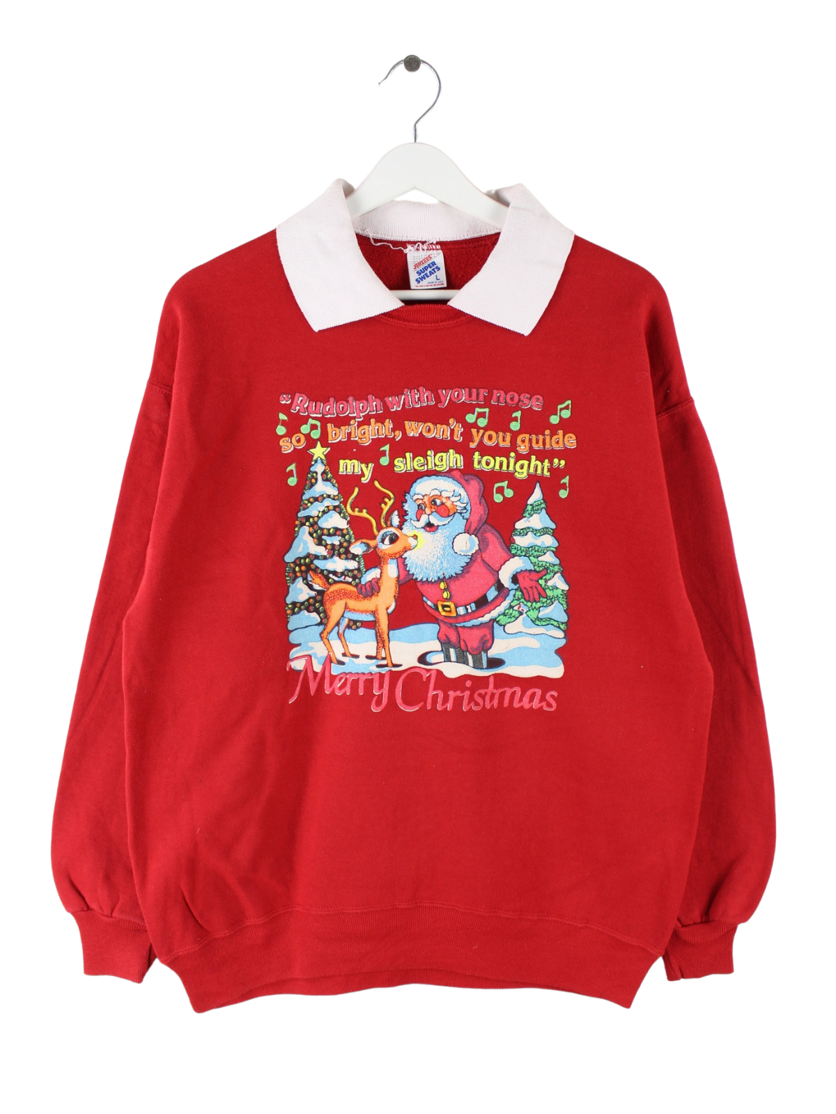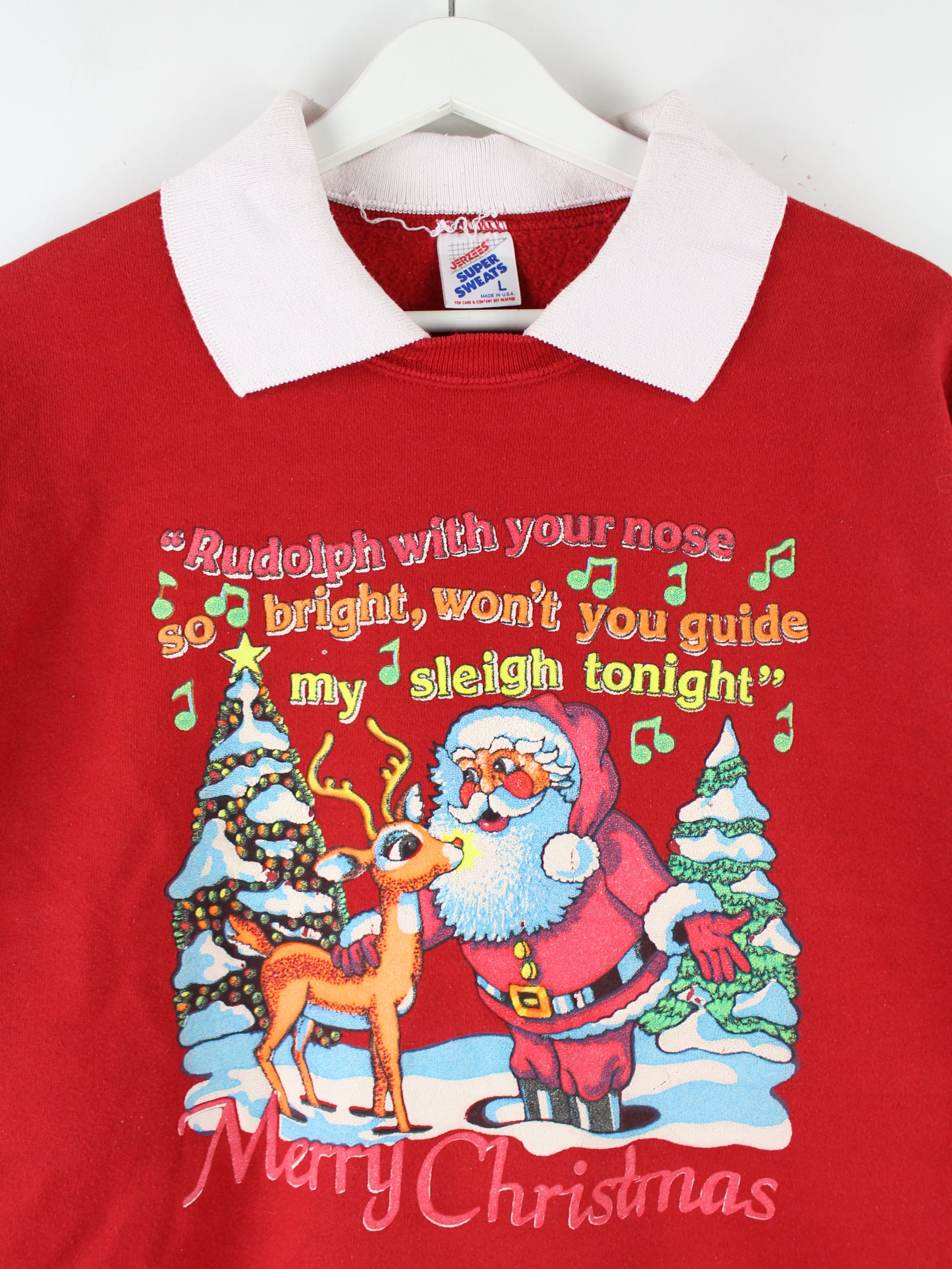 Roter Sweater vom Brand Jerzees aus den 90'ern in Größe L. Er ist aus einer Baumwollmischung angefertigt und in sehr gutem Zustand bei uns zu bekommen. Mit schickem Christmas Print.