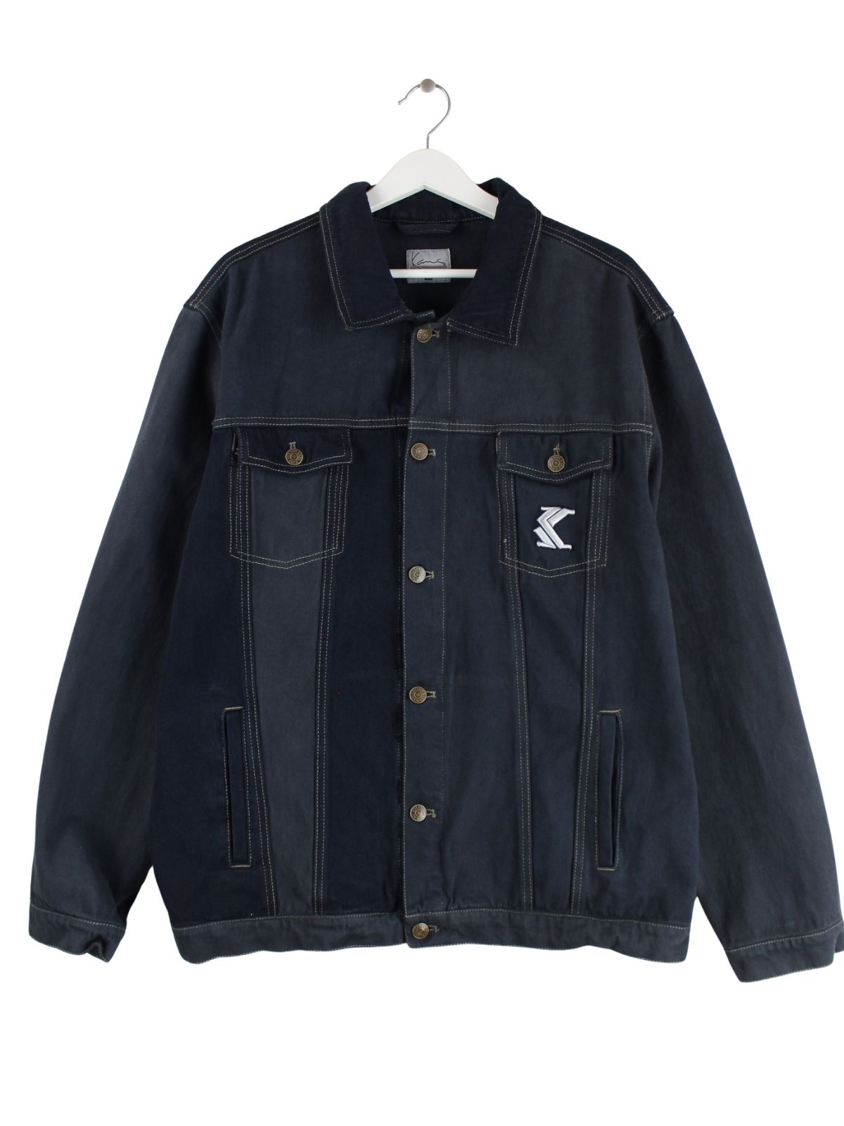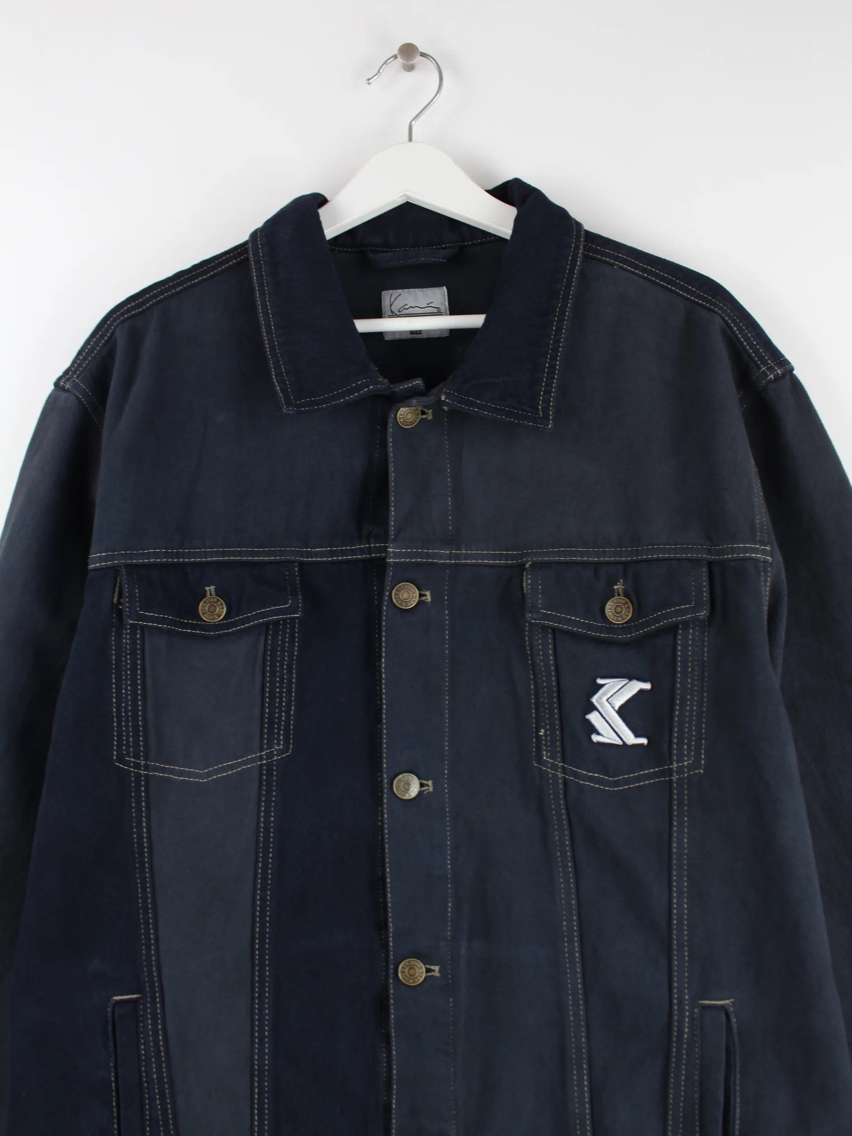 Leichte Jacke aus dem Hause Karl Kani in Größe XL aus Anfang der 2000'er. Sie ist aus Baumwolle produziert und in Blau bei uns zu bekommen.