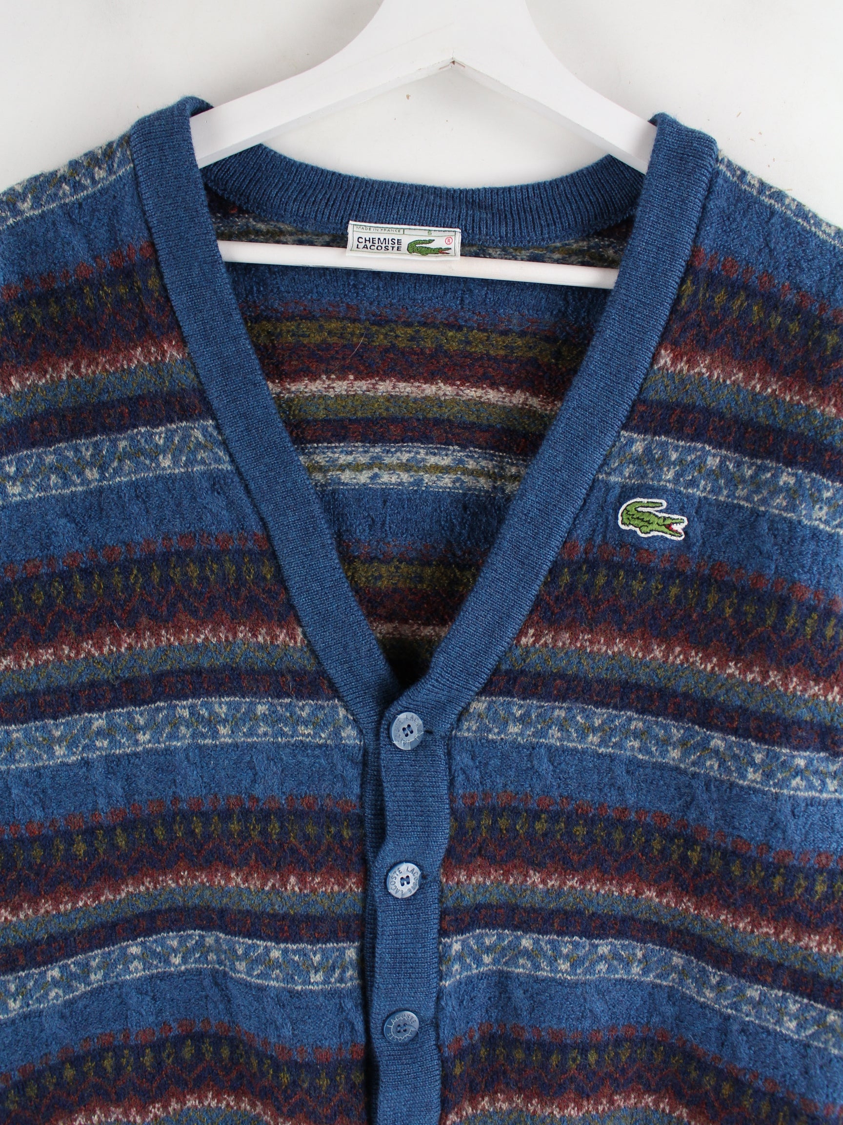 Blaue Strickjacke vom Brand Lacoste aus den 90'ern in Größe XS. Sie ist aus Wolle gemacht und in gutem Zustand im Bestand.