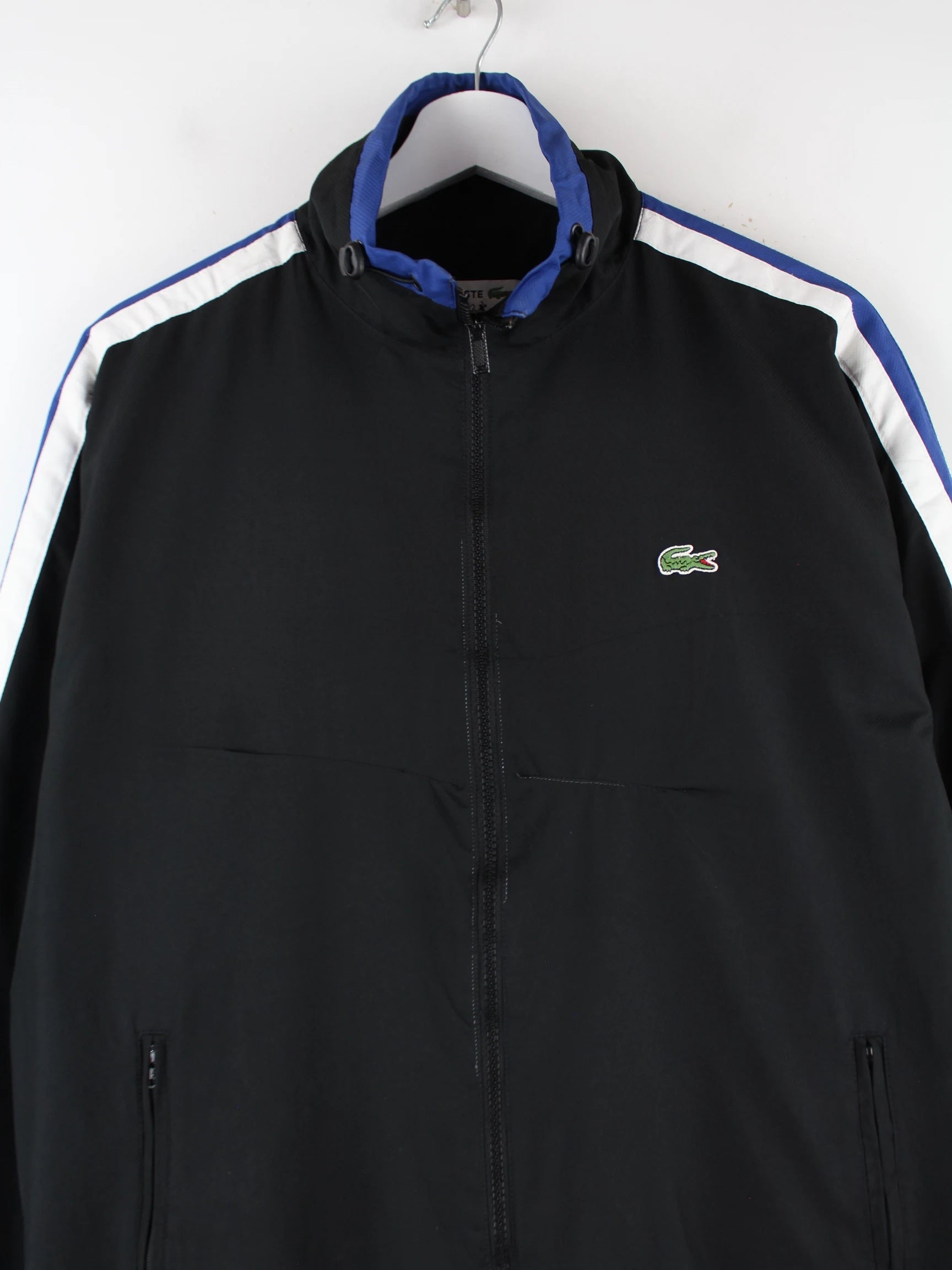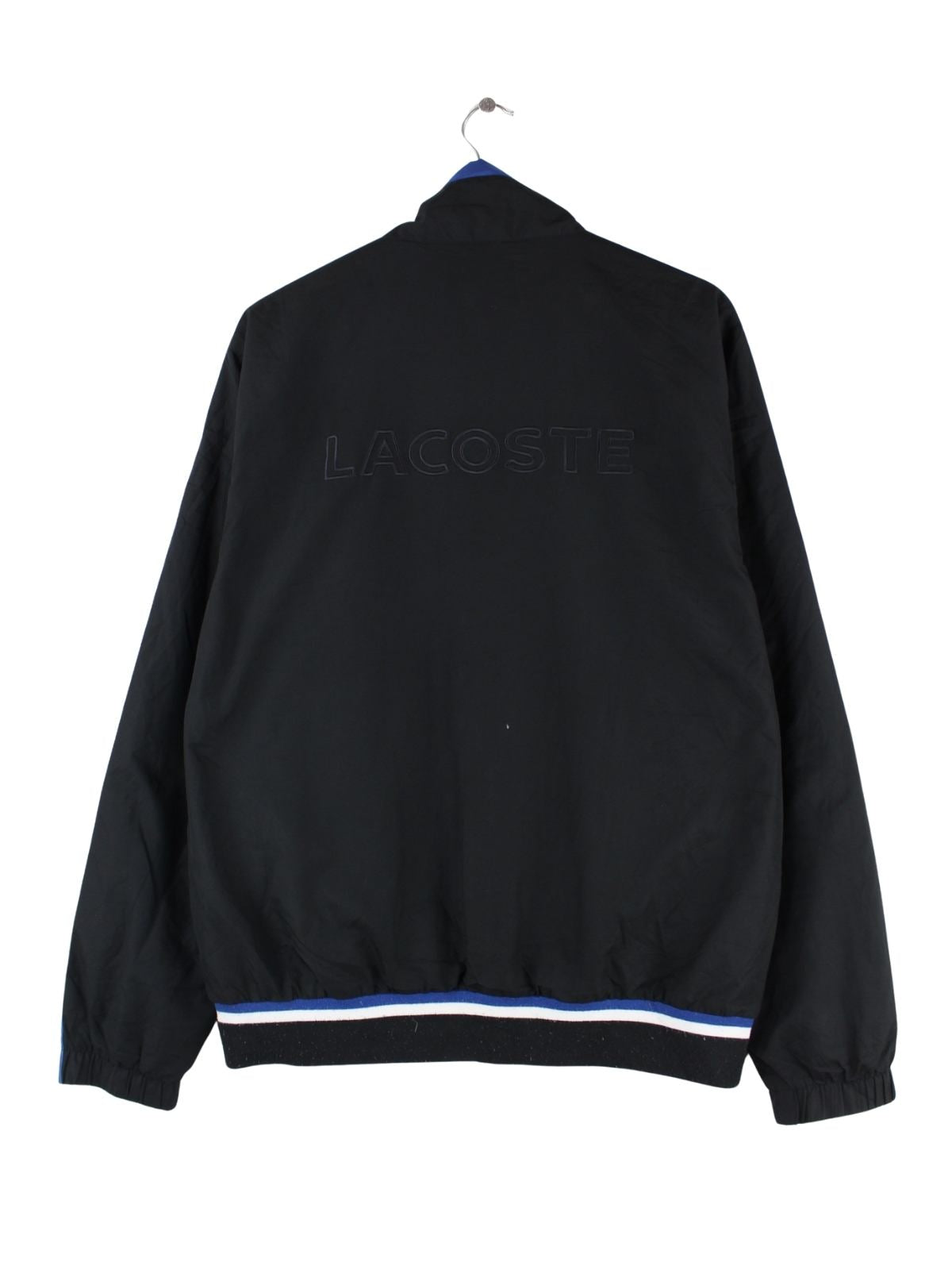 Schwarze Trainingsjacke der Brand Lacoste in Größe M. Sie ist aus Synthetik hergestellt und in sehr gutem Zustand vorrätig.