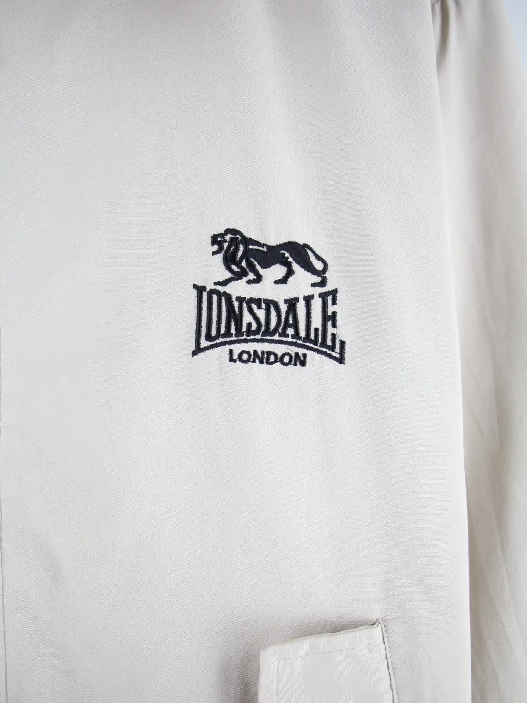 Beigefarbene Leichte Jacke aus dem Hause Lonsdale aus den 90'ern in Größe XL. Sie ist aus einer Baumwollmischung gefertigt und in gutem Zustand bei uns vorrätig.