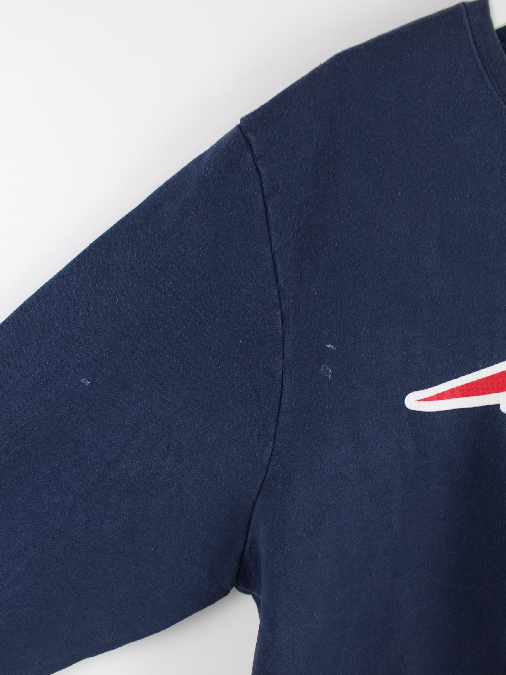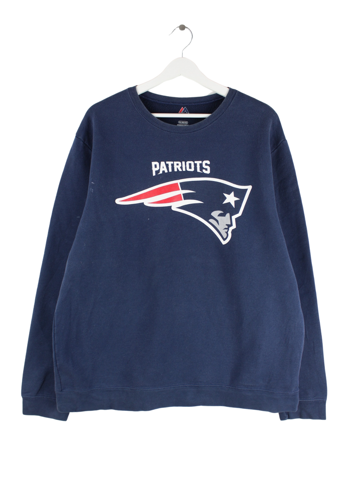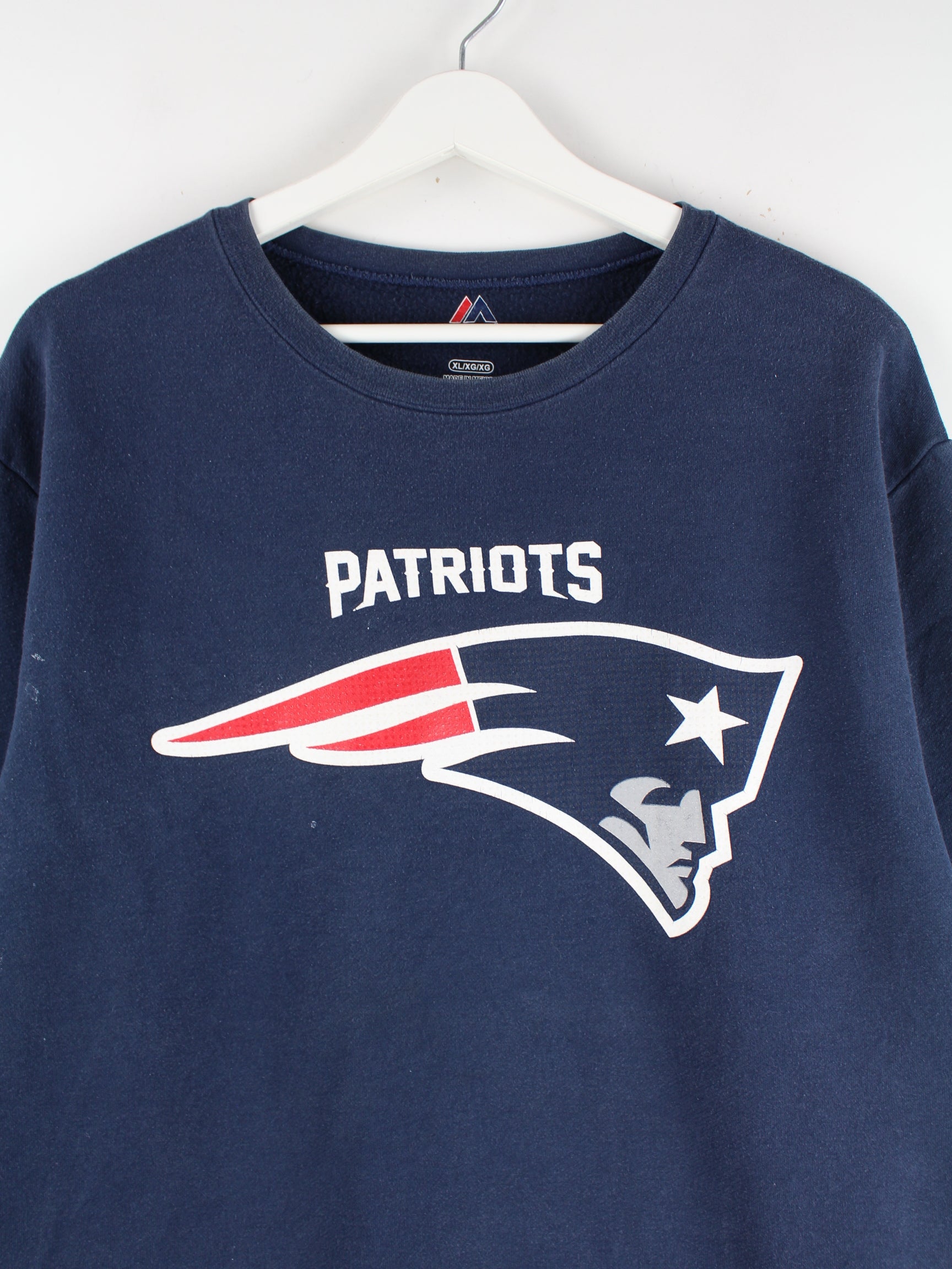 Sweater vom Brand Majestic in Größe XL. Er ist aus einer Baumwollmischung angefertigt und in Blau zu haben. Mit seltenem Patriots Print.