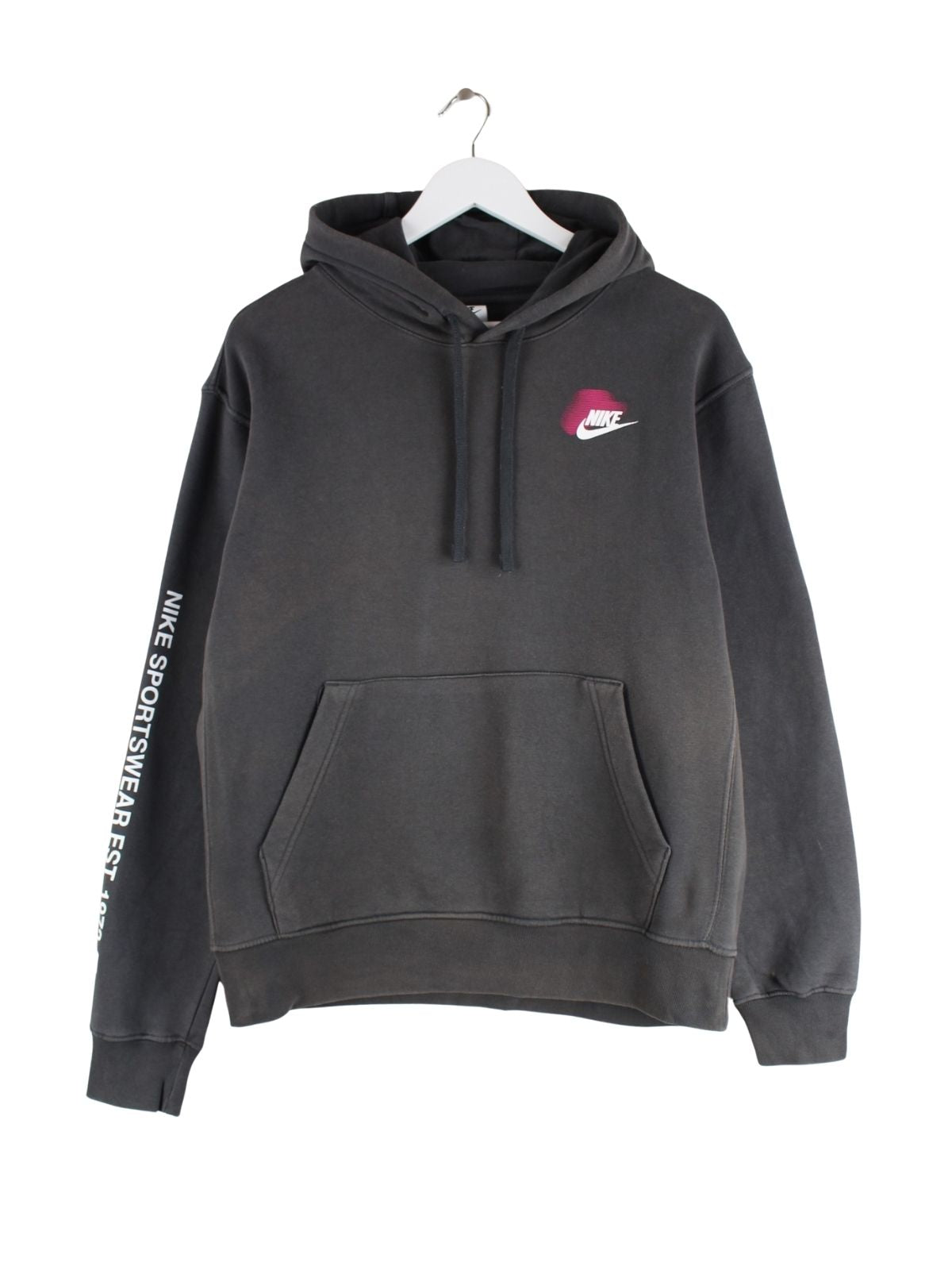 Hoodie des Labels Nike in Größe S. Er ist aus einer Baumwollmischung und in Grau auf Lager. Mit tollem Print.