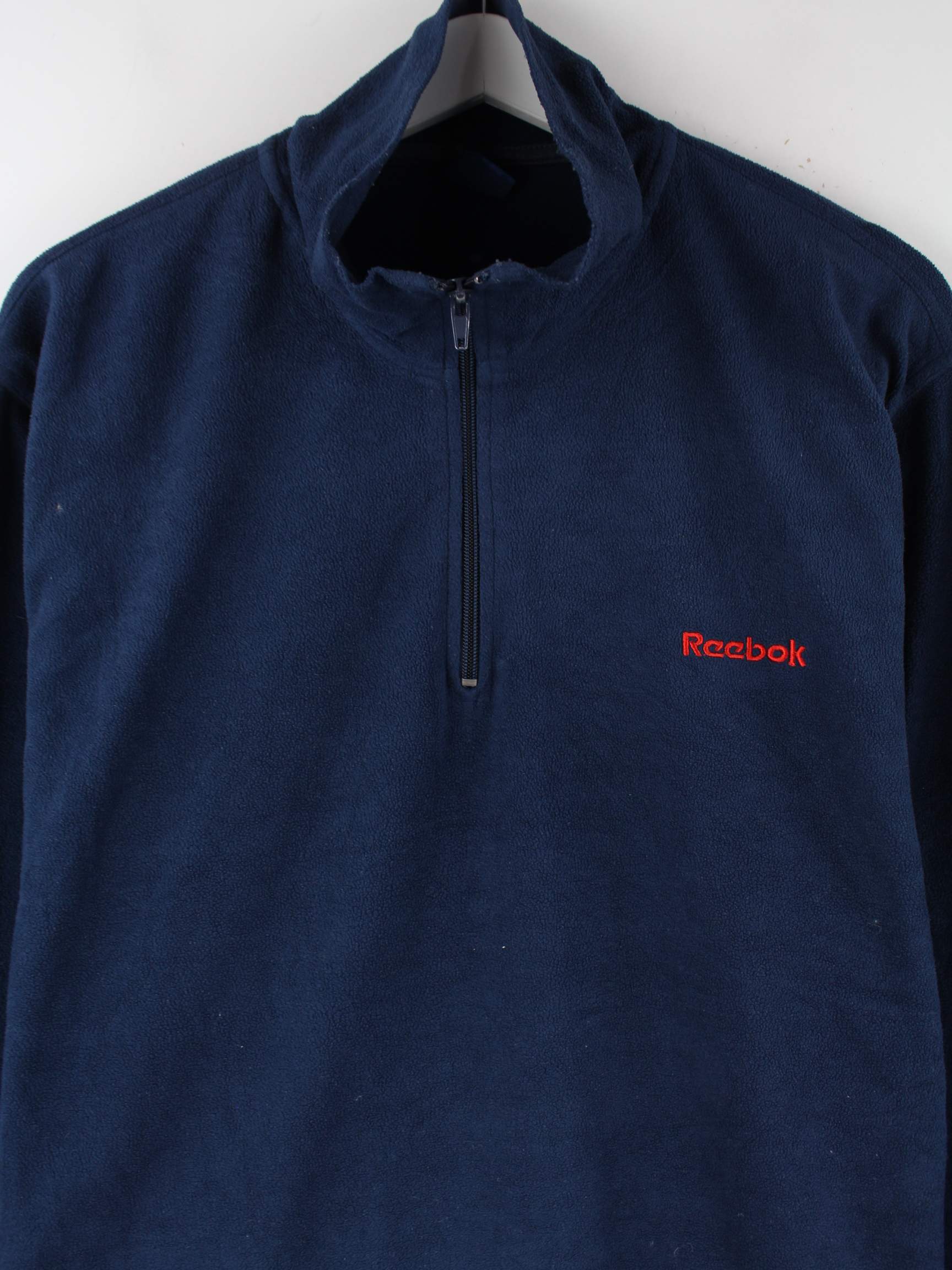 Sweater vom Brand Reebok mit kurzem Reißverschluß in Größe XL. Er ist aus angenehmem Fleece produziert und in Blau bei uns zu bekommen.