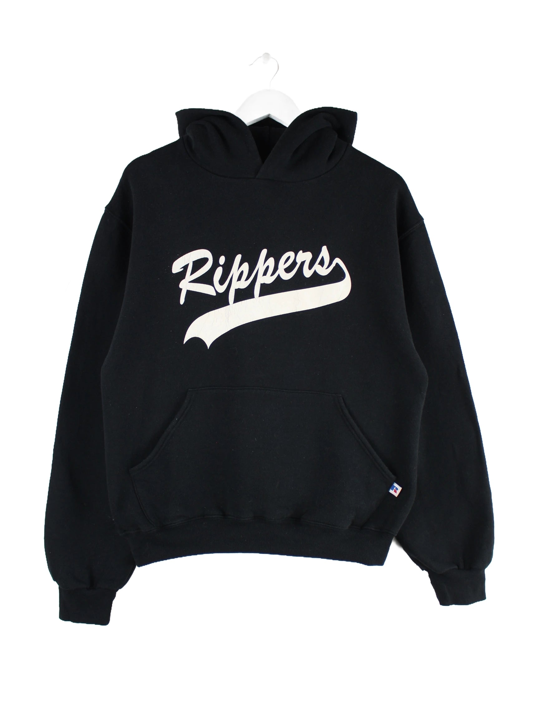 Schwarzer Hoodie aus dem Hause Russell Athletic in Größe S. Er ist aus einer Baumwollmischung gefertigt und in gutem Zustand vorrätig. Mit chiquem Rippers Print.