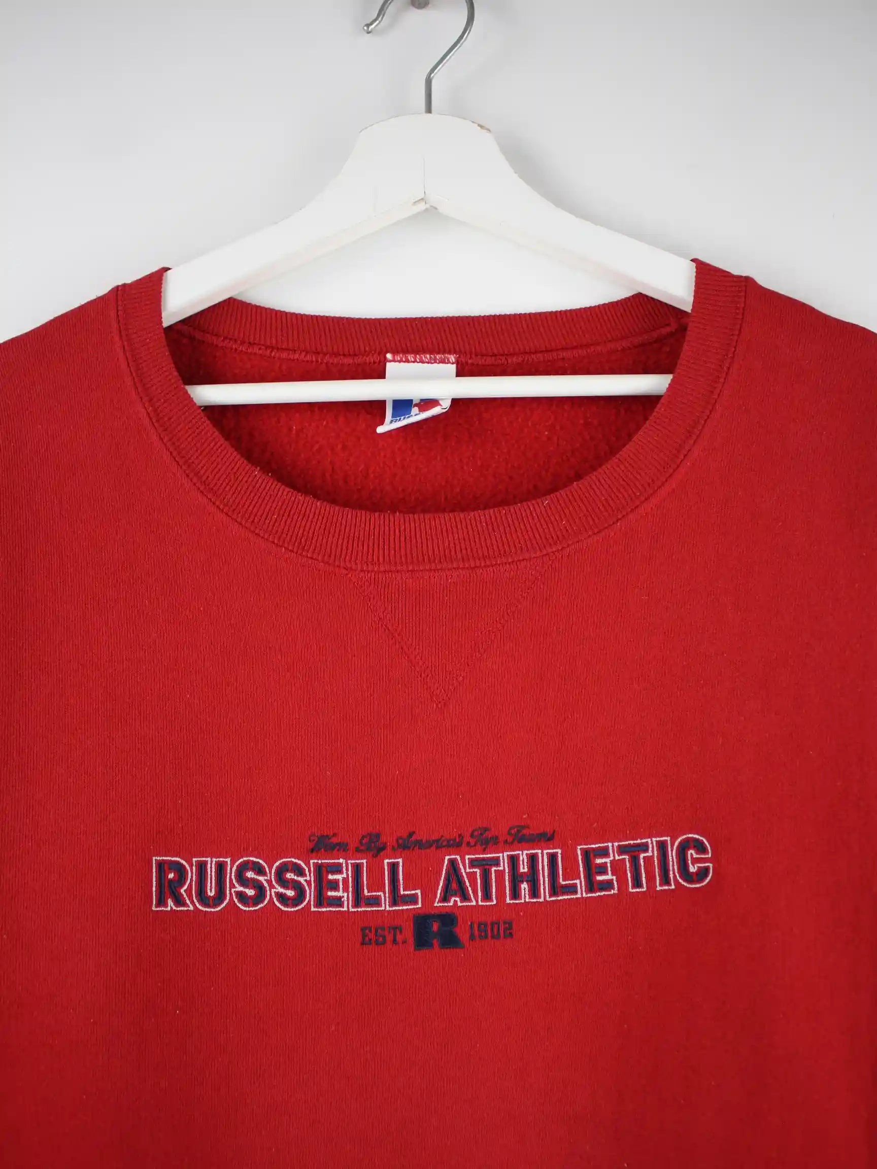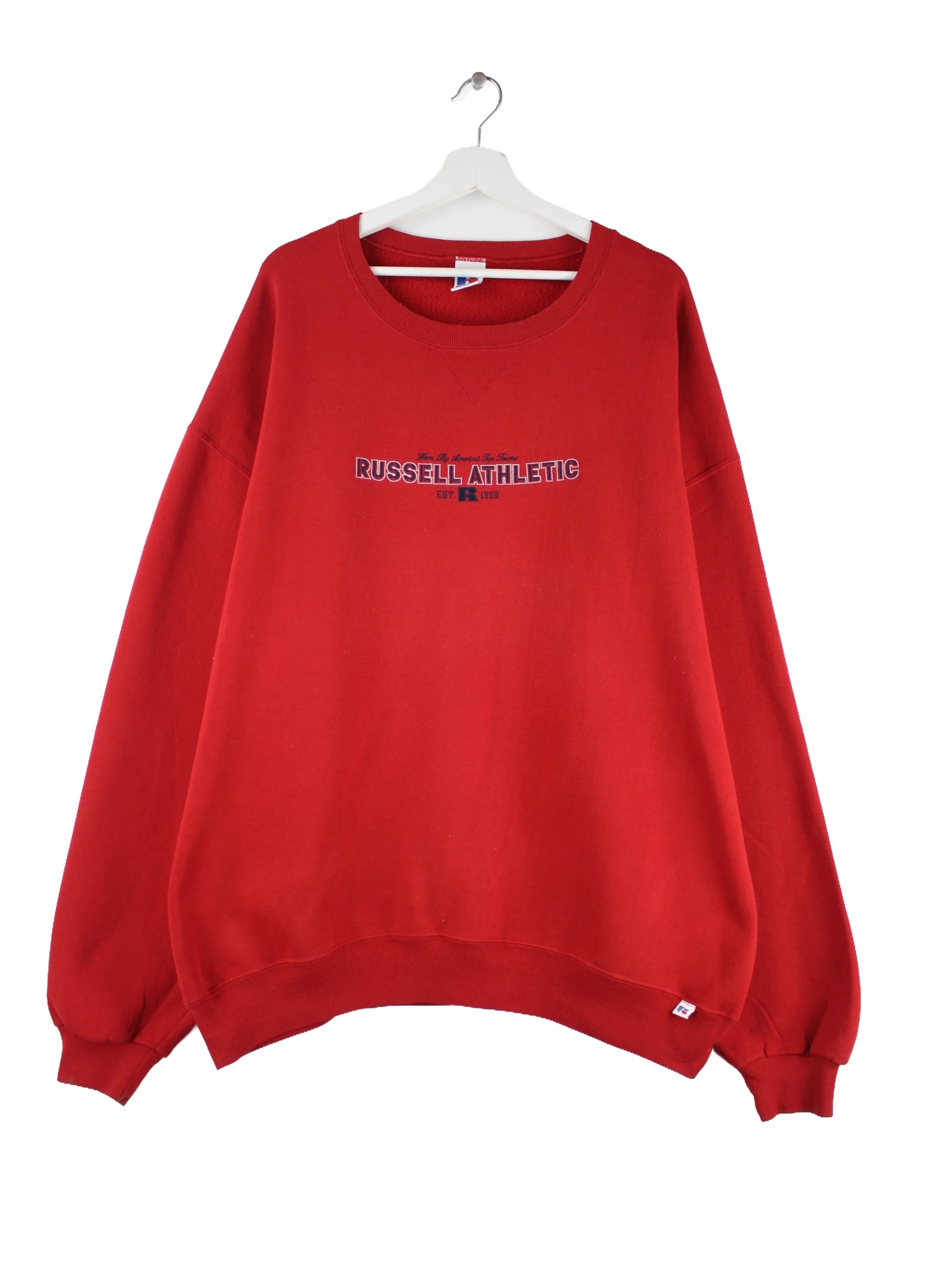 Sweater vom Label Russell Athletic in Größe XXL aus den 90'ern. Er ist aus einer Baumwollmischung angefertigt und in Rot vorrätig.
