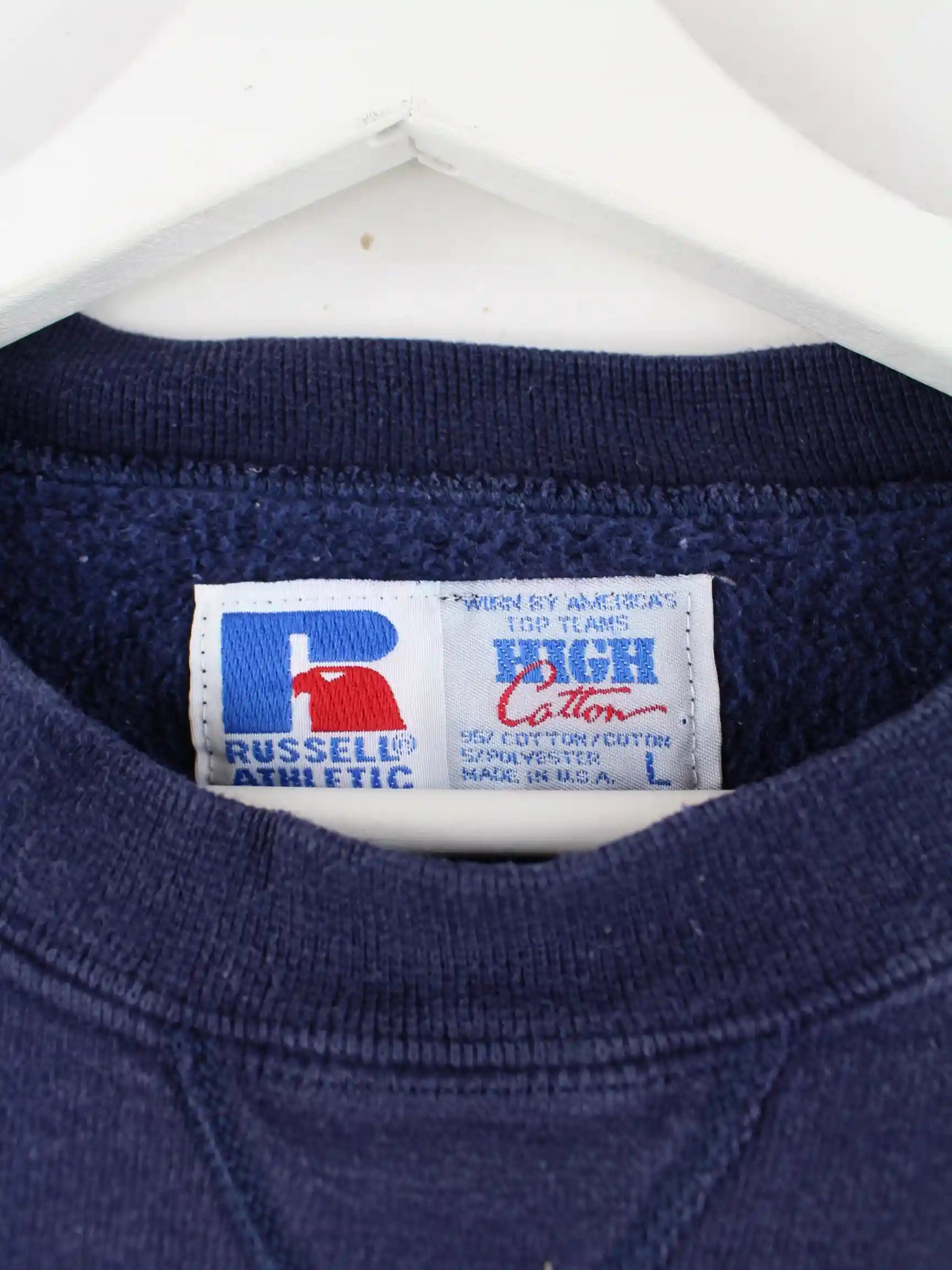 Blauer Sweater des Labels Russell Athletic aus den 90'ern in Größe L. Er ist aus einer Baumwollmischung angefertigt und in gutem Zustand vorrätig. Mit tollem State Print.
