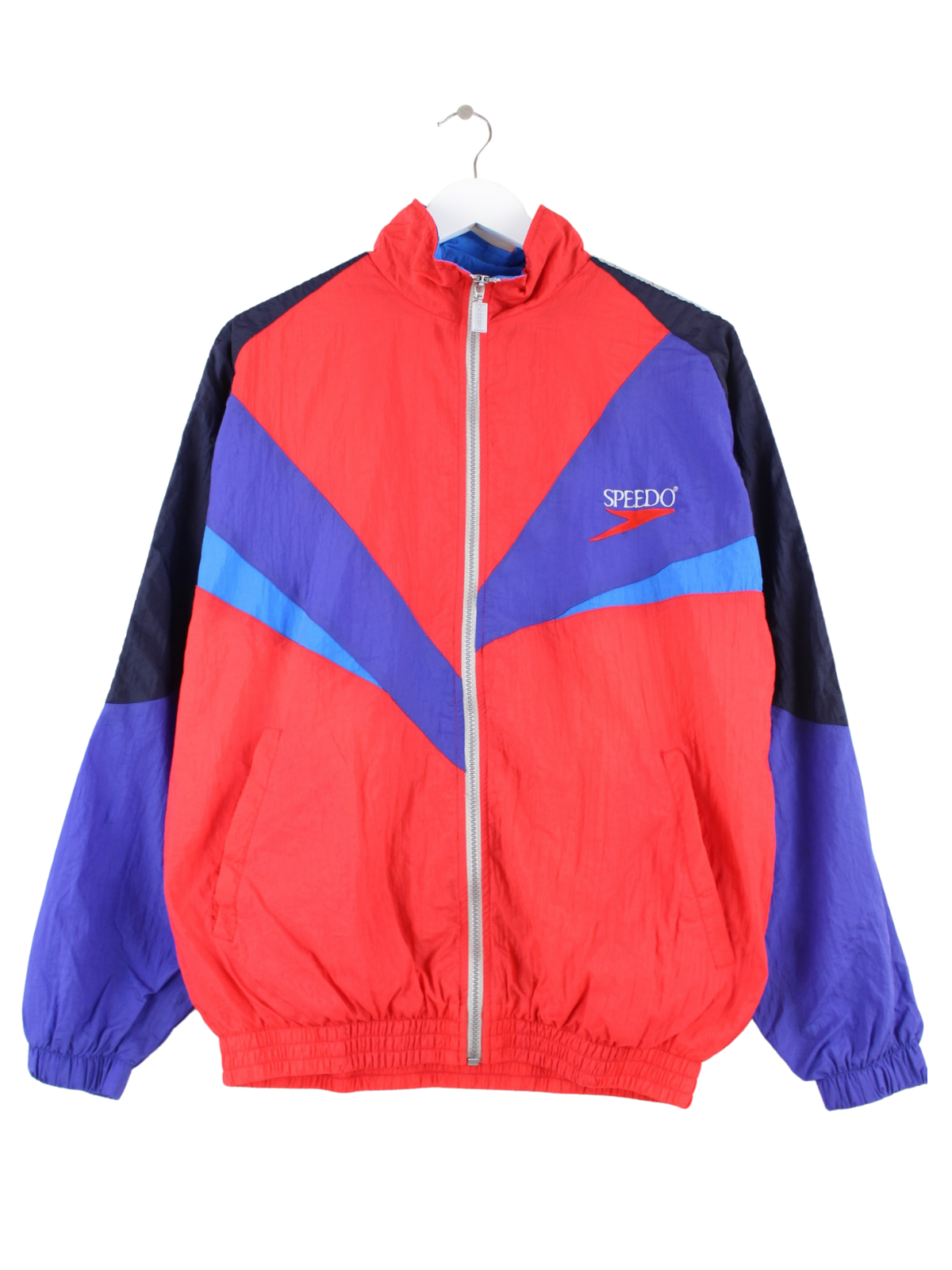 Training jacket from the Speedo label with embroidered logo in size M from the 80's. It is made of synthetic material and available in bright colors.
