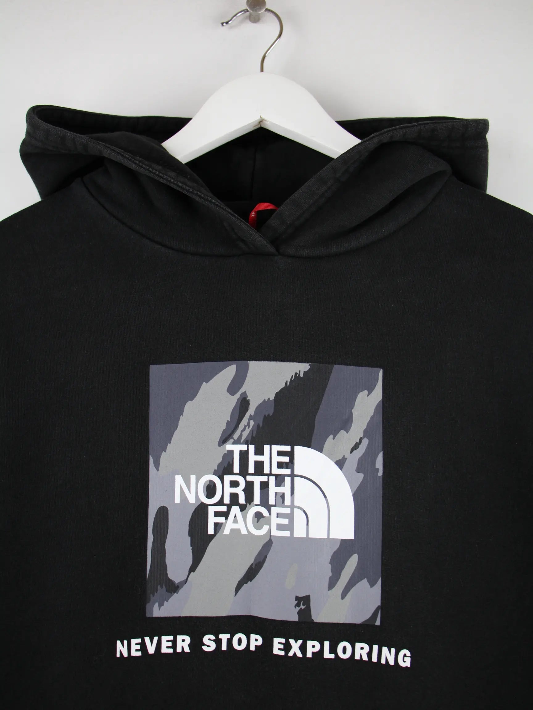 Schwarzer Hoodie vom Label The North Face in Größe M. Er ist aus einer Baumwollmischung gefertigt und in gutem Zustand zu haben. Mit chiquem Print.