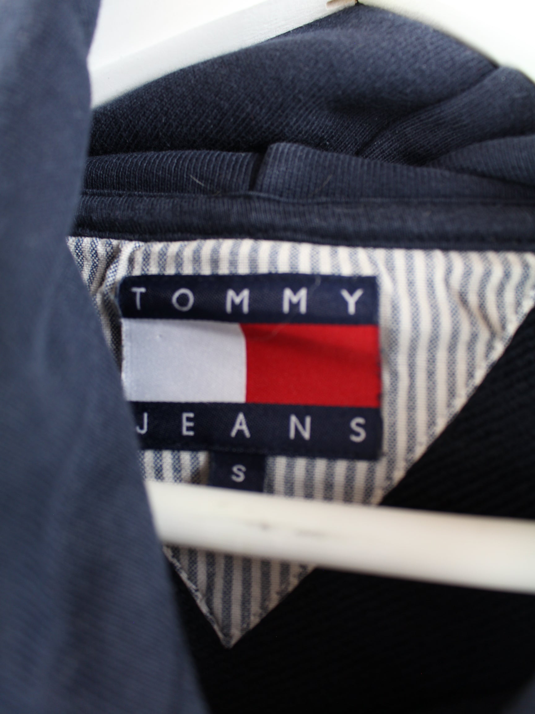 Hoodie from the Tommy Hilfiger brand with embroidered motifs in size S from the 90s. It is made of a cotton blend and is available in blue.